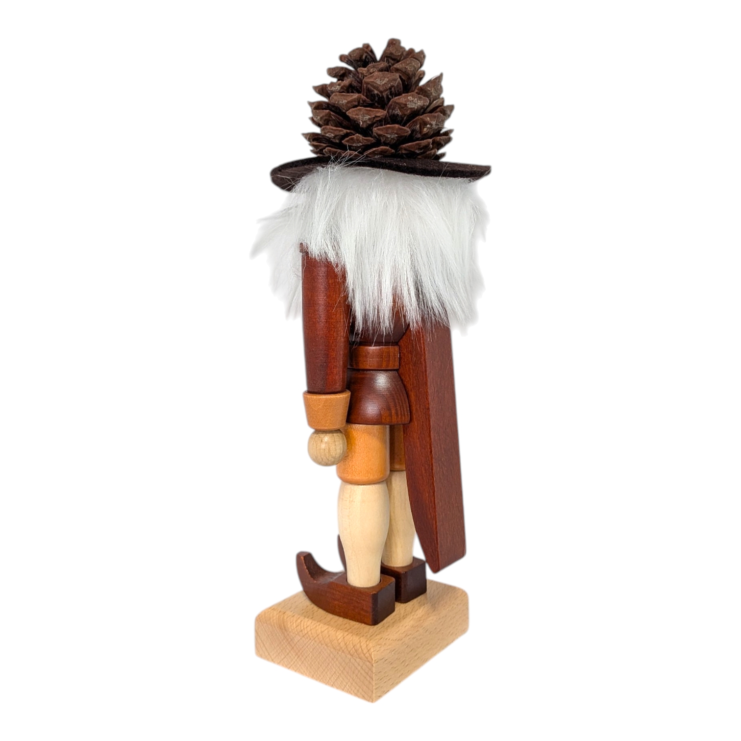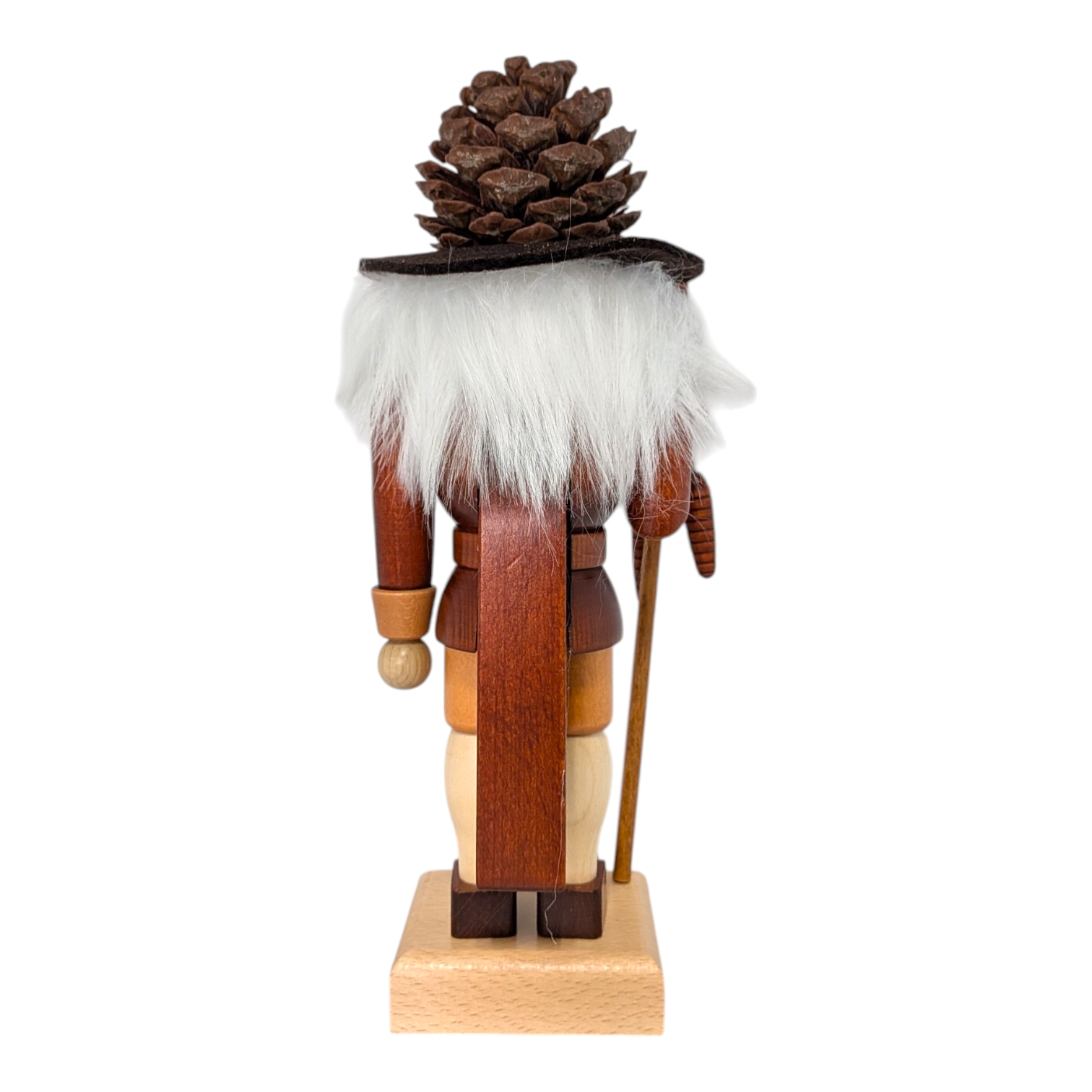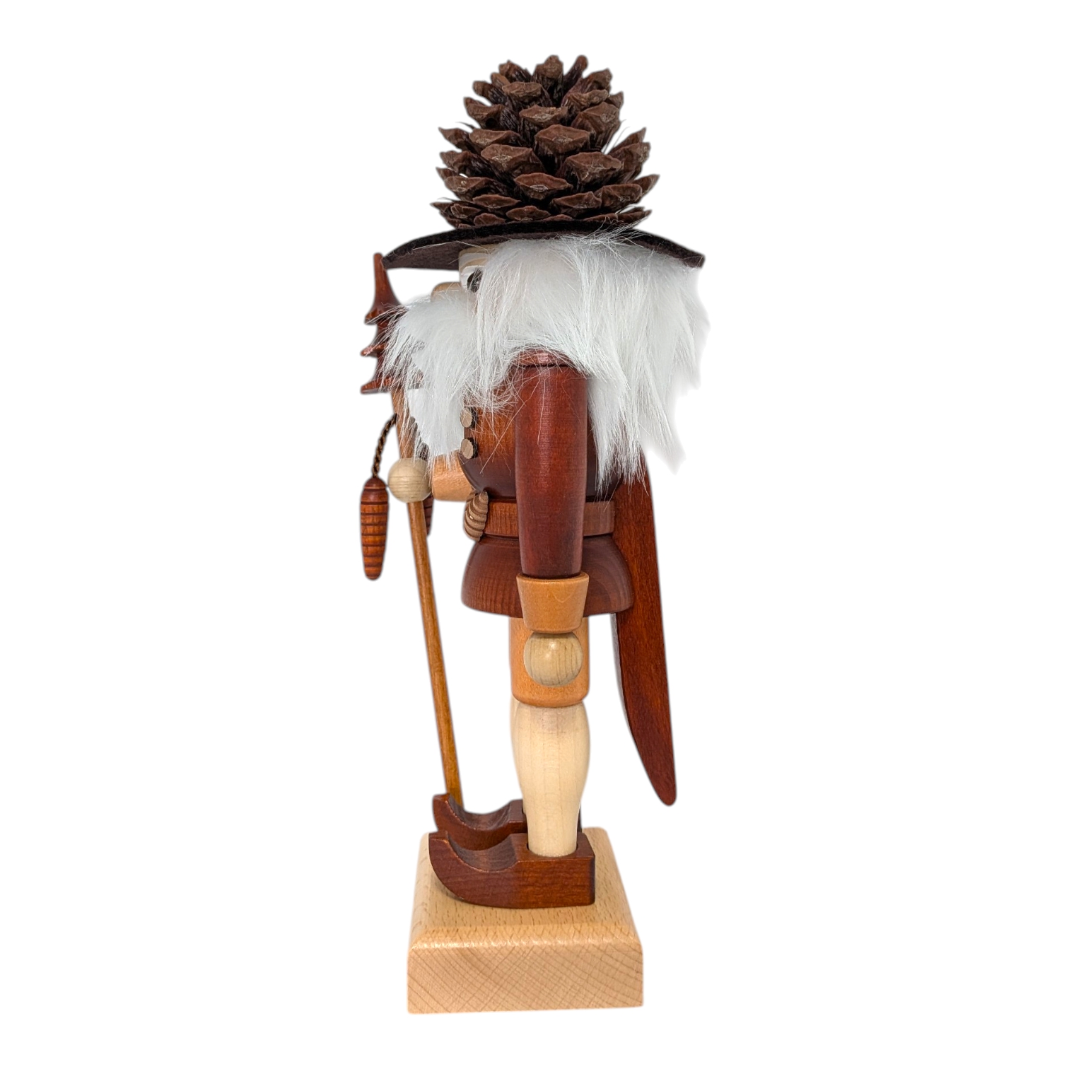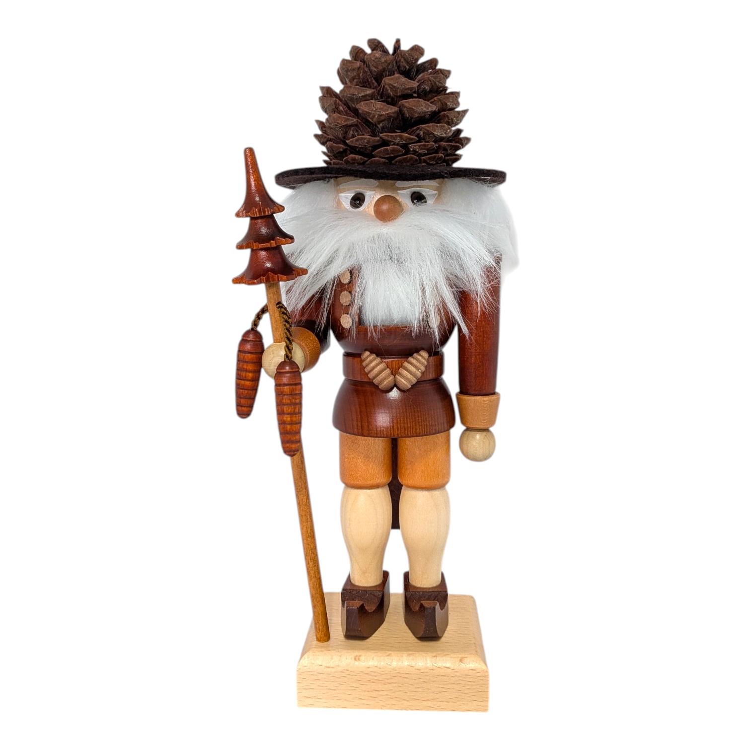 Besonders schön: In der rechten Hand hält er einen langen Stab, an dem ein gedrechselter Tannenzapfen hängt – fein gearbeitet und liebevoll im Detail. Oben auf dem Stab sitzt ein kleiner Weihnachtsbaum, ebenfalls aus Holz gedrechselt. Nichts wackelt, nichts fällt ab – hier stimmt jedes Detail.