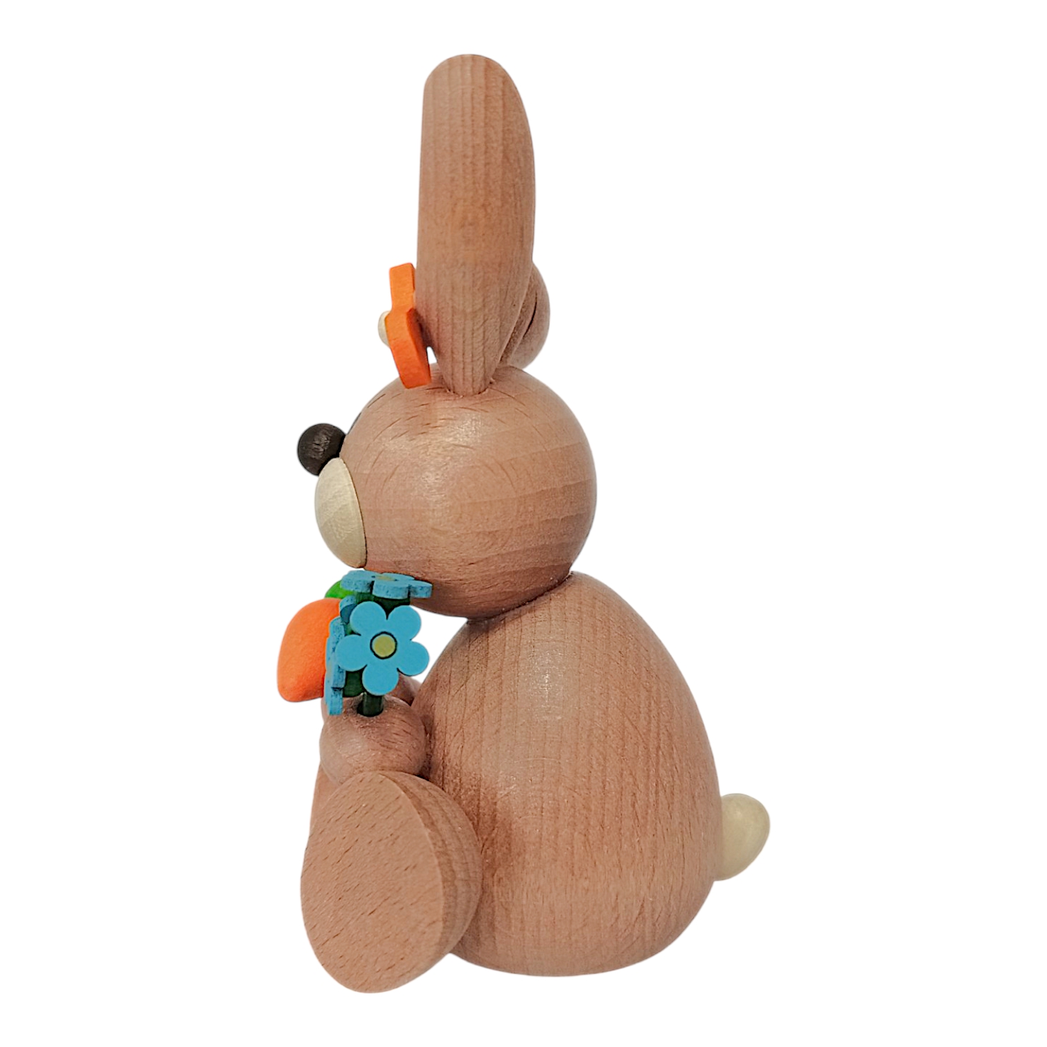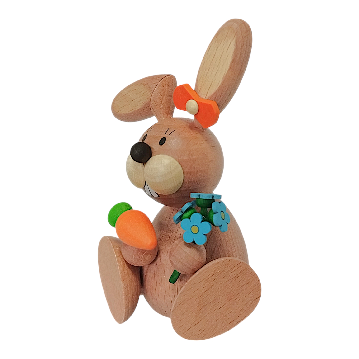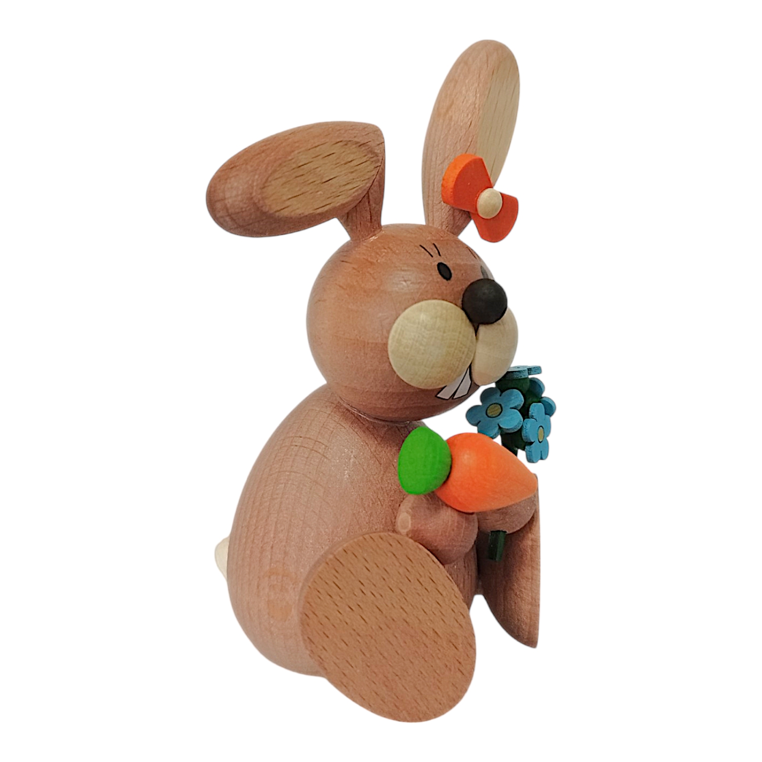 Diese charmante Osterhäsin sitzend mit Möhre und Vergissmeinnicht besticht durch ihre natürliche Ausstrahlung und die liebevolle Gestaltung im Stil traditioneller Holzkunst. Die Figur ist ganz in Natur gehalten, wodurch die feine Maserung des Holzes besonders schön zur Geltung kommt und der Häsin eine warme, authentische Note verleiht. Sie blickt mit wachen Augen freundlich in die Welt, wobei die hell abgesetzten Backen und die zwei typischen weißen Nagerzähne ihr ein drolliges Aussehen verleihen. Eines ihrer langen Löffelohren knickt keck zur Seite, während das andere aufrecht steht und mit einer hübschen, orangefarbenen Schleife verziert ist.