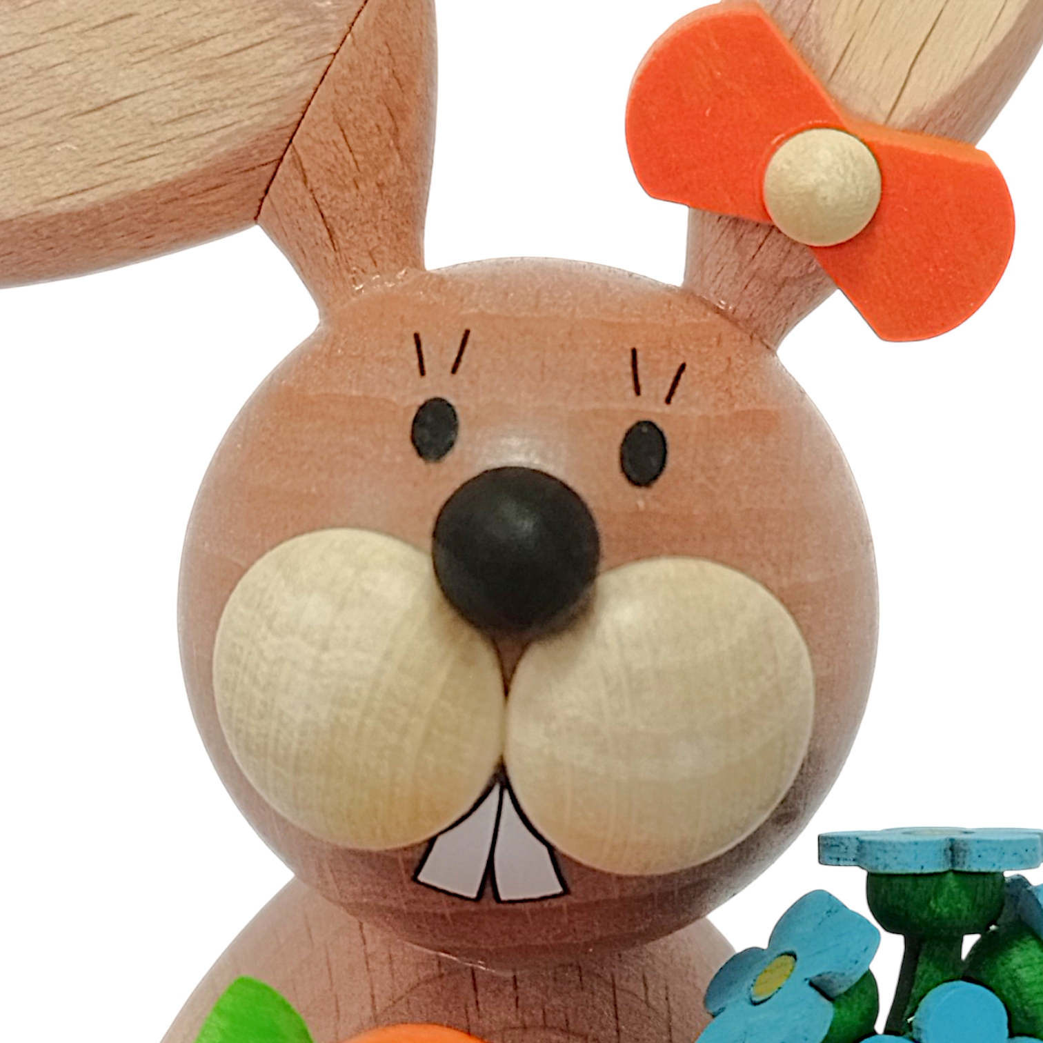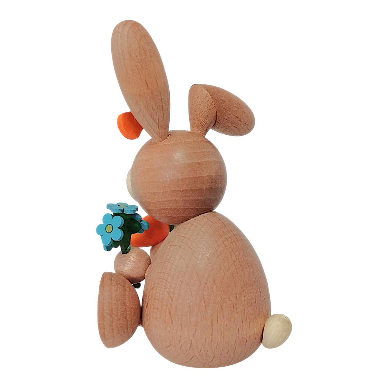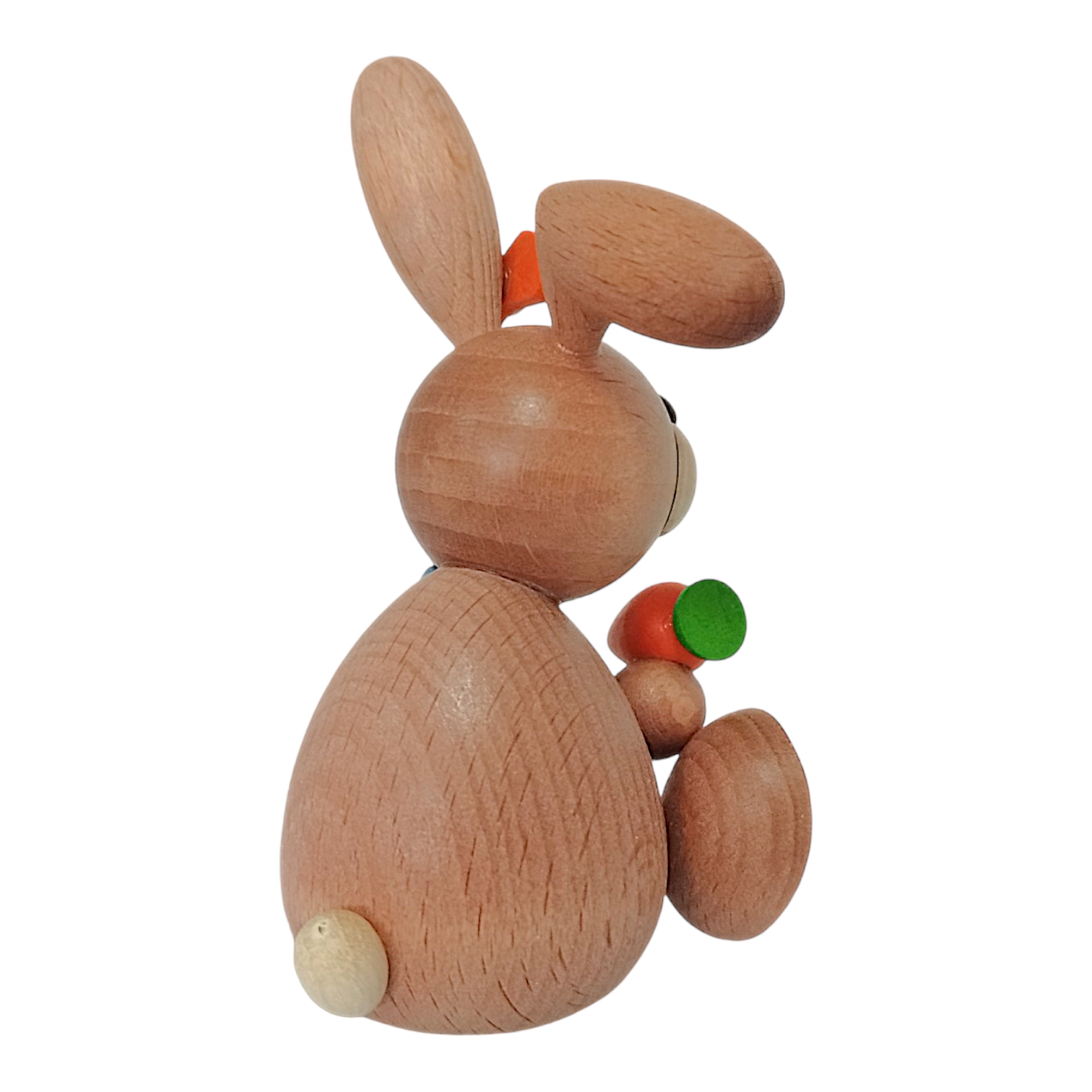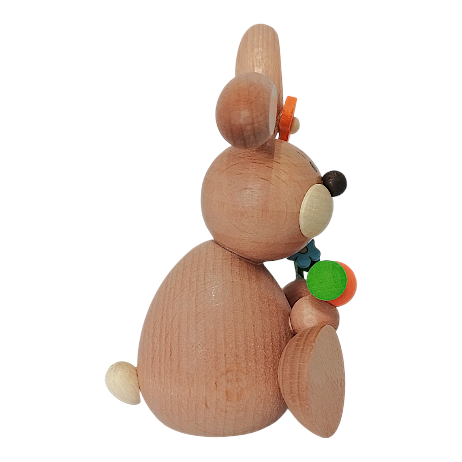 Diese charmante Osterhäsin sitzend mit Möhre und Vergissmeinnicht besticht durch ihre natürliche Ausstrahlung und die liebevolle Gestaltung im Stil traditioneller Holzkunst. Die Figur ist ganz in Natur gehalten, wodurch die feine Maserung des Holzes besonders schön zur Geltung kommt und der Häsin eine warme, authentische Note verleiht. Sie blickt mit wachen Augen freundlich in die Welt, wobei die hell abgesetzten Backen und die zwei typischen weißen Nagerzähne ihr ein drolliges Aussehen verleihen. Eines ihrer langen Löffelohren knickt keck zur Seite, während das andere aufrecht steht und mit einer hübschen, orangefarbenen Schleife verziert ist.