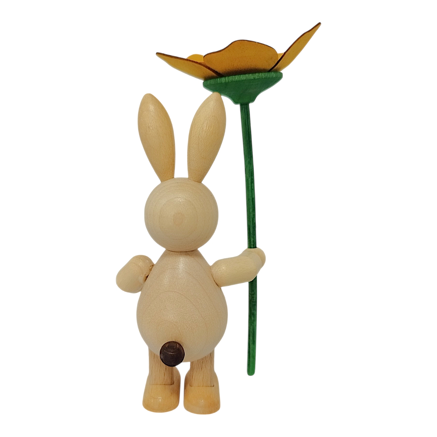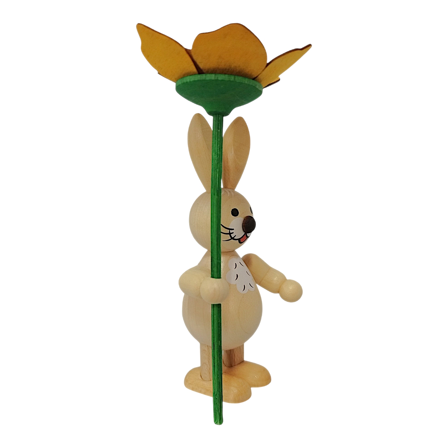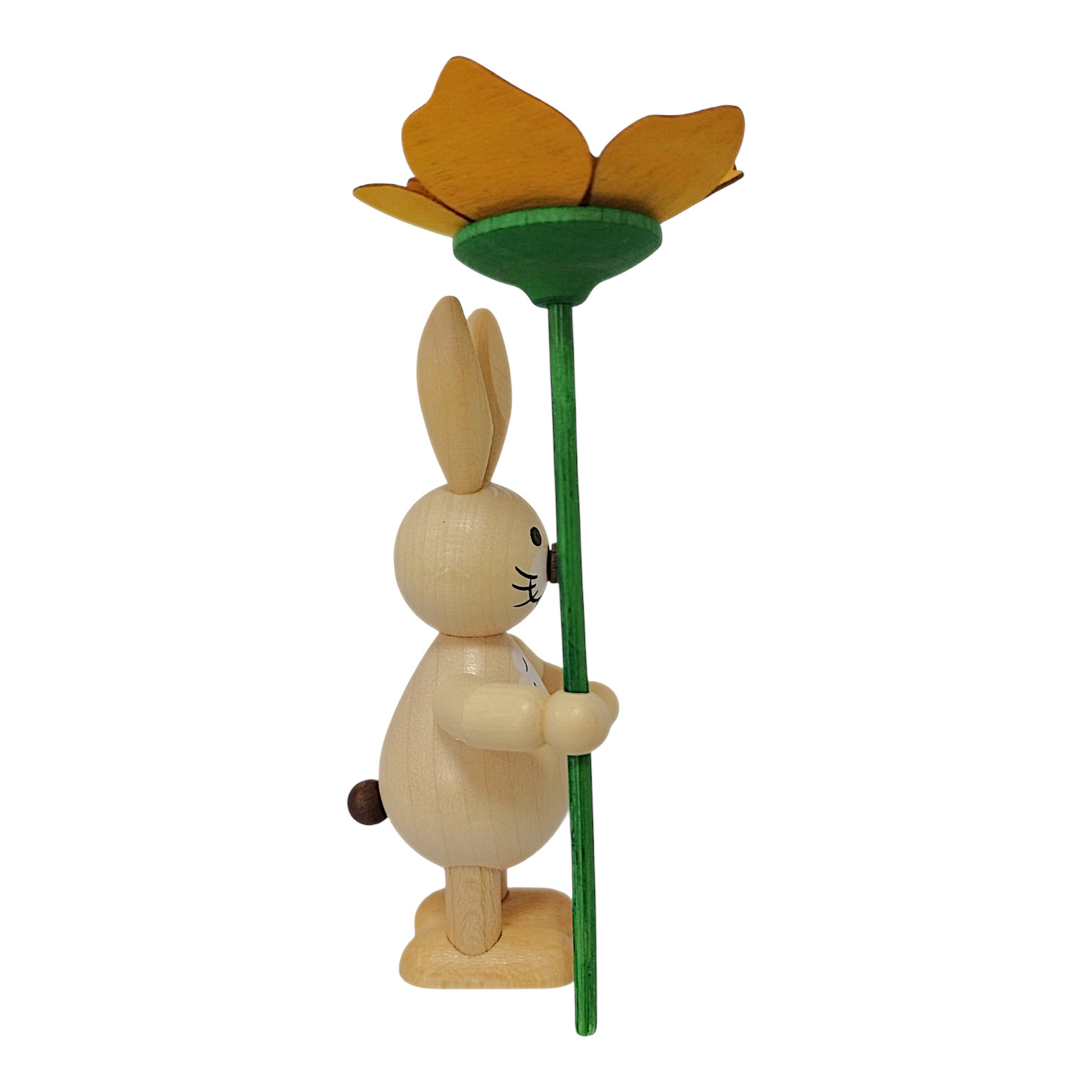 Neues aus dem Hasenland: Dieser charmante Osterhase mit Blume wird in liebevoller sowie detailreicher Handarbeit von der Drechslerei Volkmar Wagner hergestellt. Die freundlichen und stets gut gelaunten Osterhasen der Drechslerei gibt es in allen Lebenslagen, sie bringen die traditionelle Handwerkskunst des Erzgebirges direkt zu dir nach Hause.