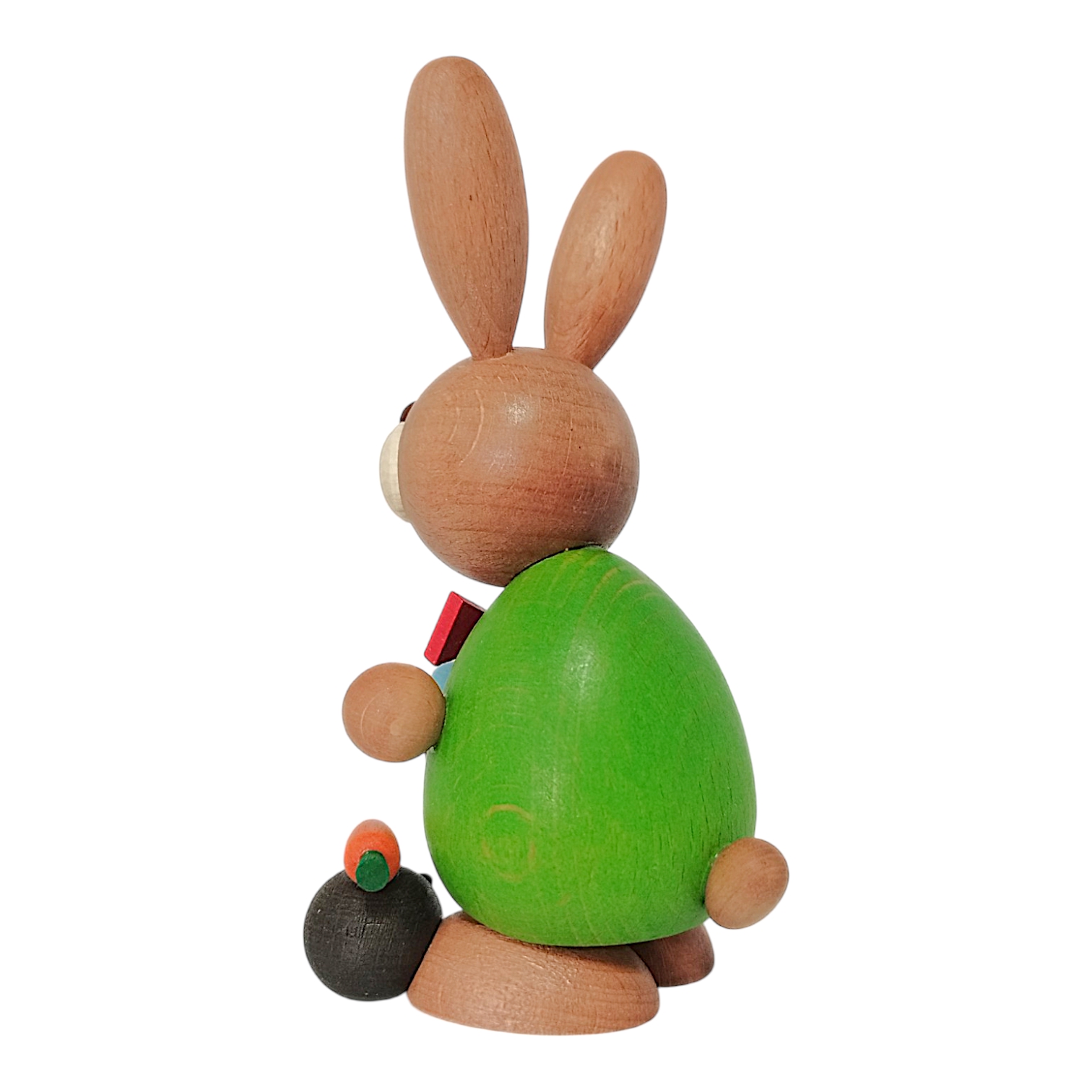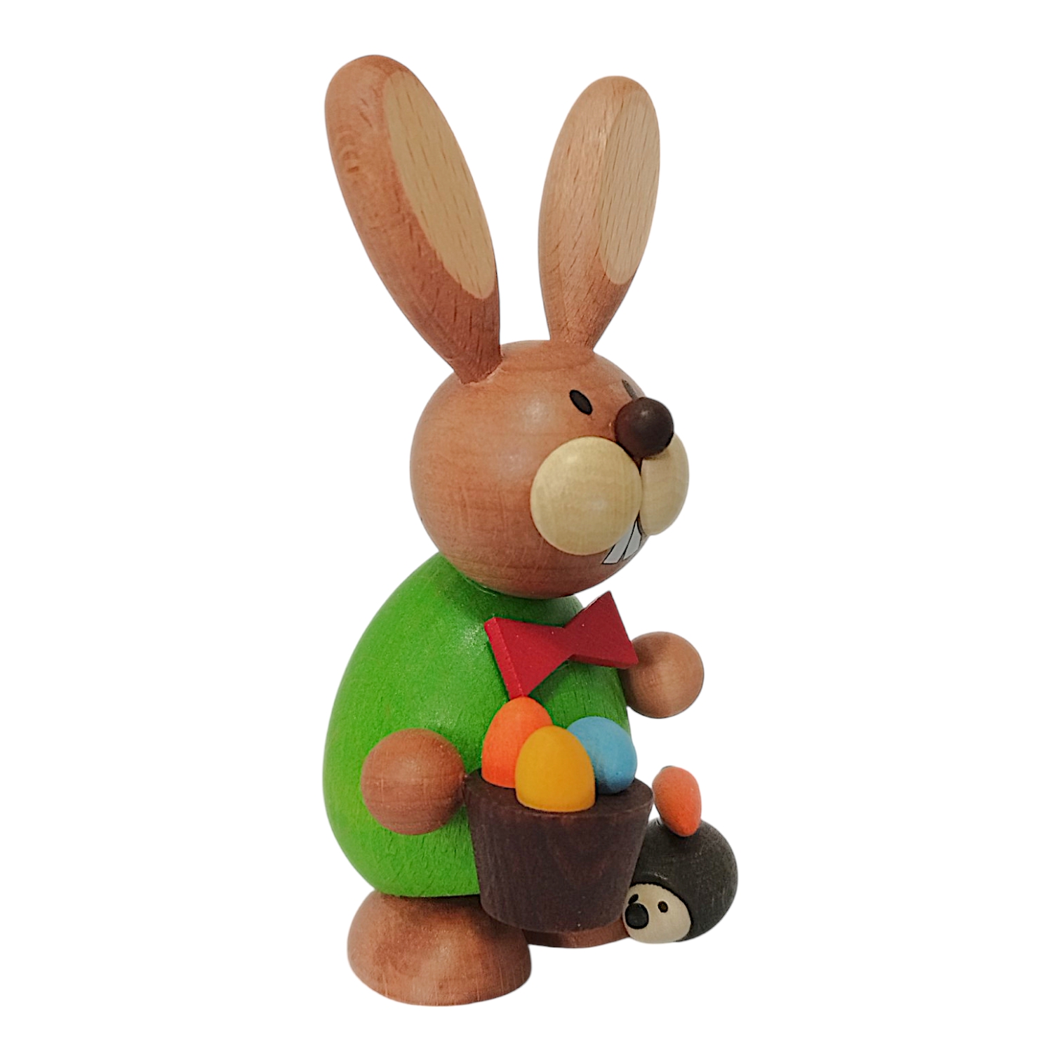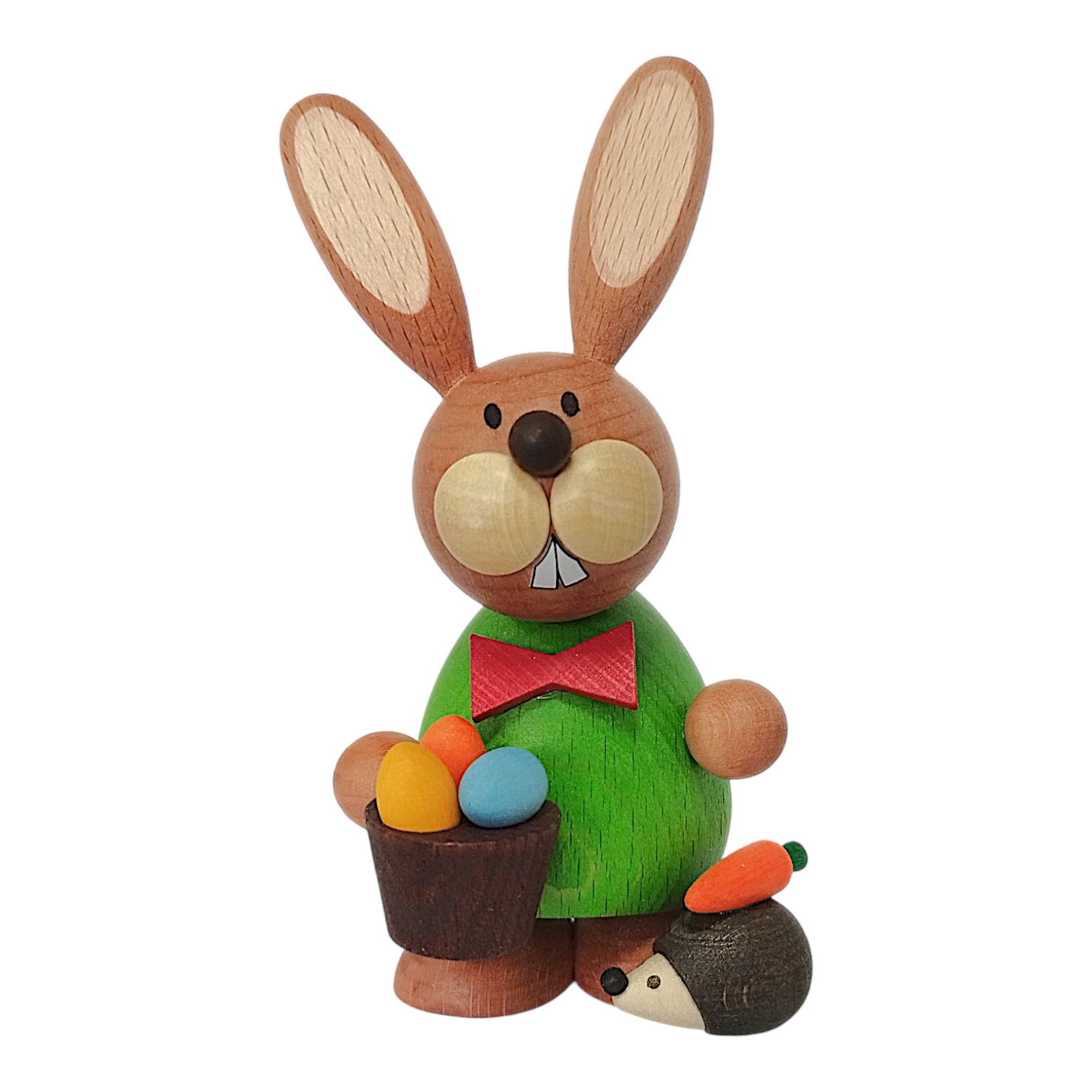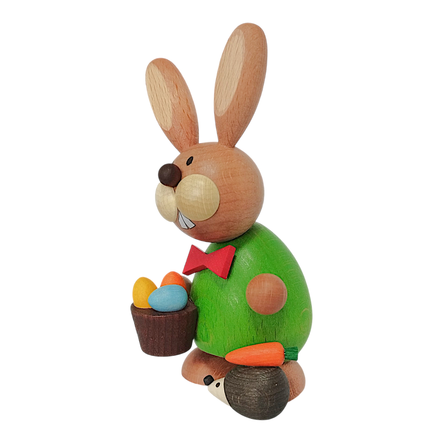Ein besonderes Highlight ist die kleine Szenerie zu seinen Füßen: Dort befindet sich ein niedlicher kleiner Igel mit dunklem Stachelkleid, auf dessen Rücken eine leuchtend orangefarbene Möhre mit grünem Kraut liegt. Die Figur besticht durch ihre harmonischen, runden Formen und ist ein wunderbares Beispiel für detailreiche Handwerkskunst, die traditionelle Elemente mit farbenfroher Gestaltung vereint.