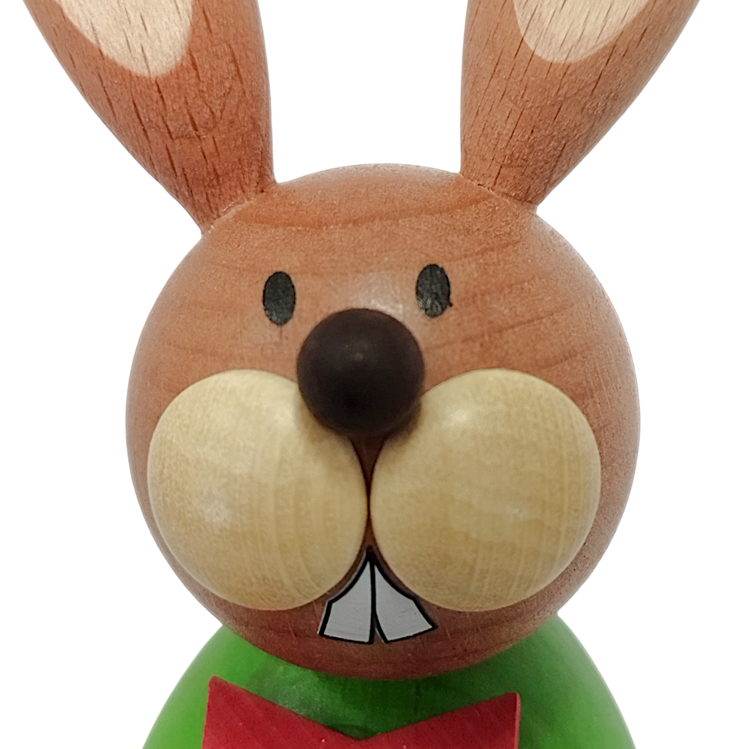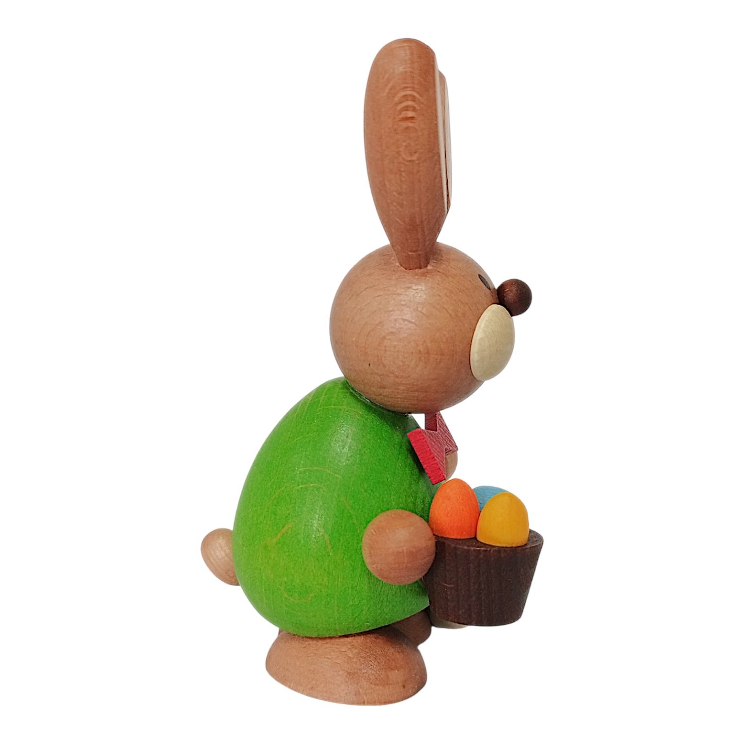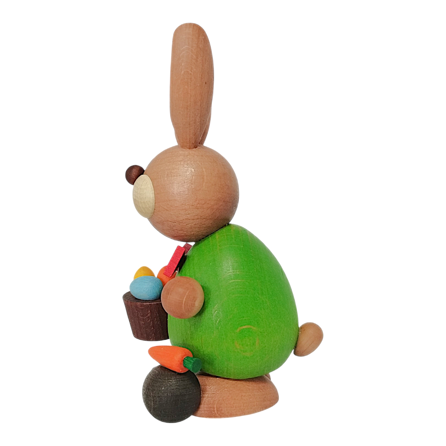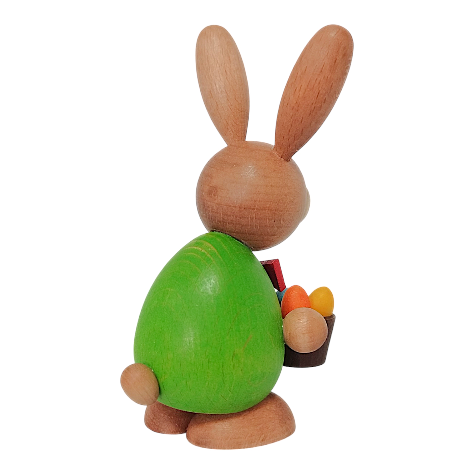 Das freundliche Gesicht zeichnet sich durch die charakteristischen großen, hellen Backen und die zwei typischen Nagezähne aus. Die langen Ohren sind naturfarben mit hellen Innenflächen gestaltet und unterstreichen die natürliche Optik des Holzes. In seinen Pfoten hält der Hase einen dunkelbraunen Korb, der mit bunten Eiern in Orange, Gelb und Blau gefüllt ist.
