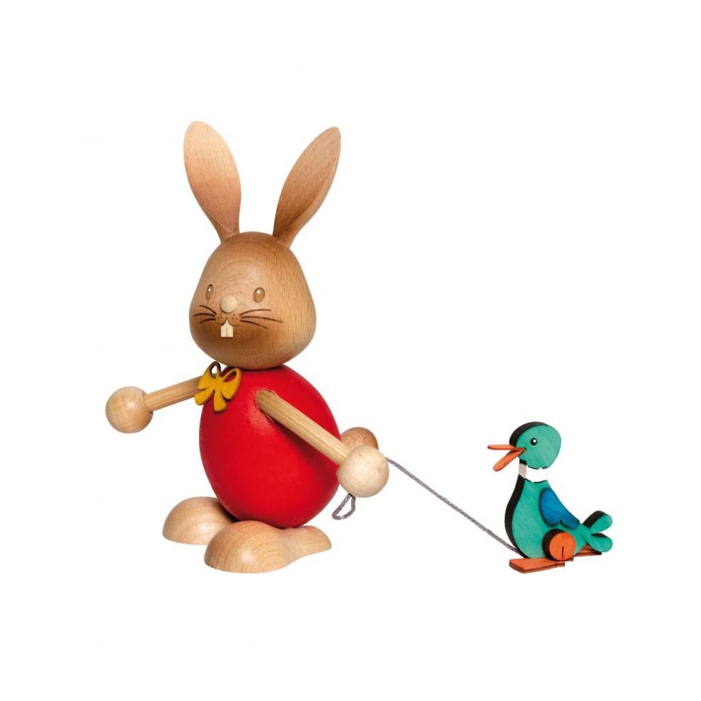 Gut gelaunt geht der kleine Hase, im roten Oberteil, mit seiner Nachziehente spazieren.