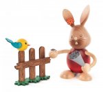 Dieser Osterhase Stupsi mit Vogel, füttert einen kleinen, süßen Vogel, welcher sich auf einem Zaun niedergelassen hat.