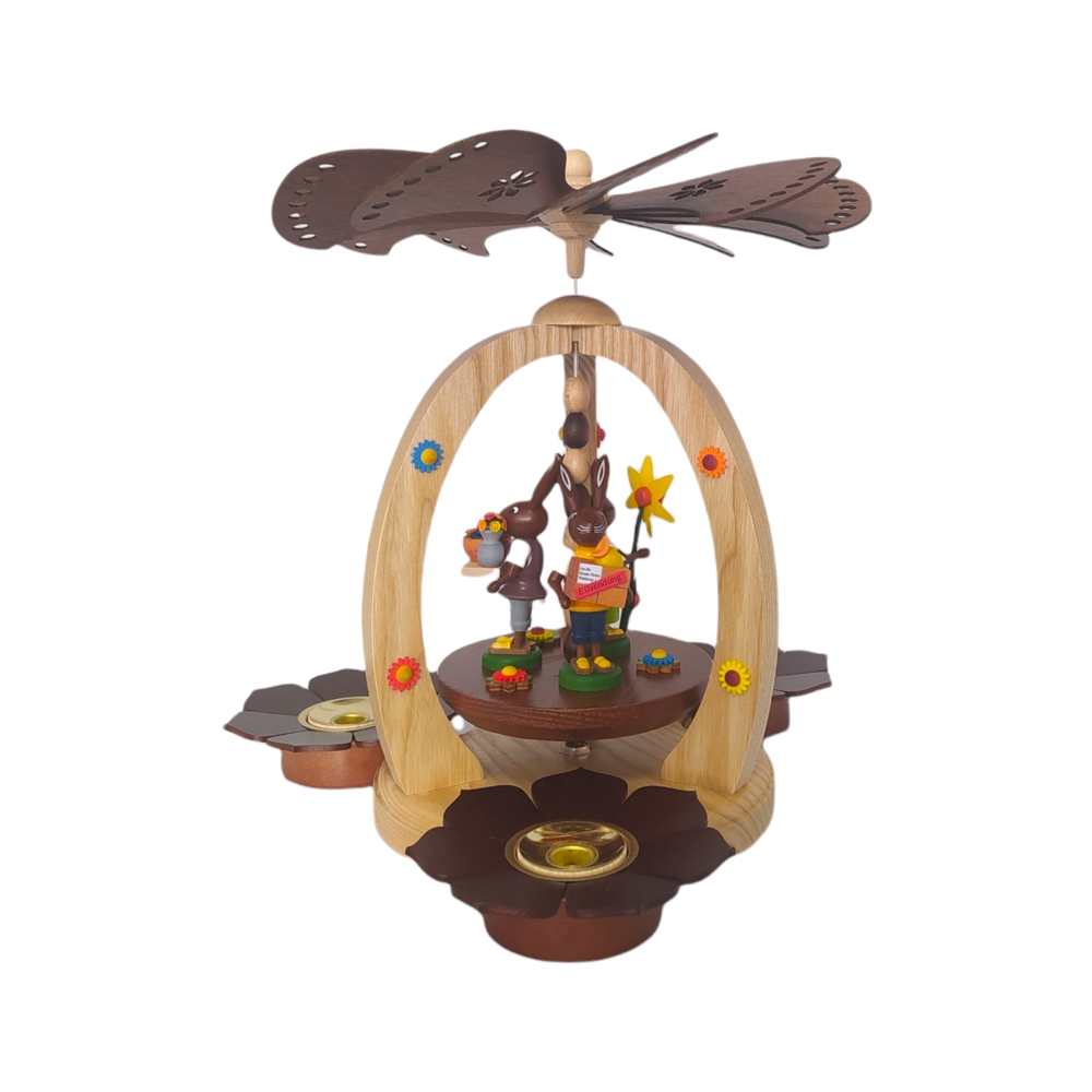 Pyramiden gehören für viele Haushalte zur Weihnachtszeit einfach dazu, das gemütliches Licht der Kerzen zaubert ein besinnliches und warmes Licht welches zum verweilen einlädt. Doch nicht nur zur Weihnachtszeit lieben den Lichterschein der Pyramiden auch an Ostern erfreuen sich frühlingshafte sowie österliche Pyramiden mittlerweile größter Beliebtheit. Drei helle Bögen welche mit bunten Blumen geschmückt sind bilden den Rahmen für 3 in kräftigen Farben von Hand bemalte Osterhasen aus dem Hause Preißler.