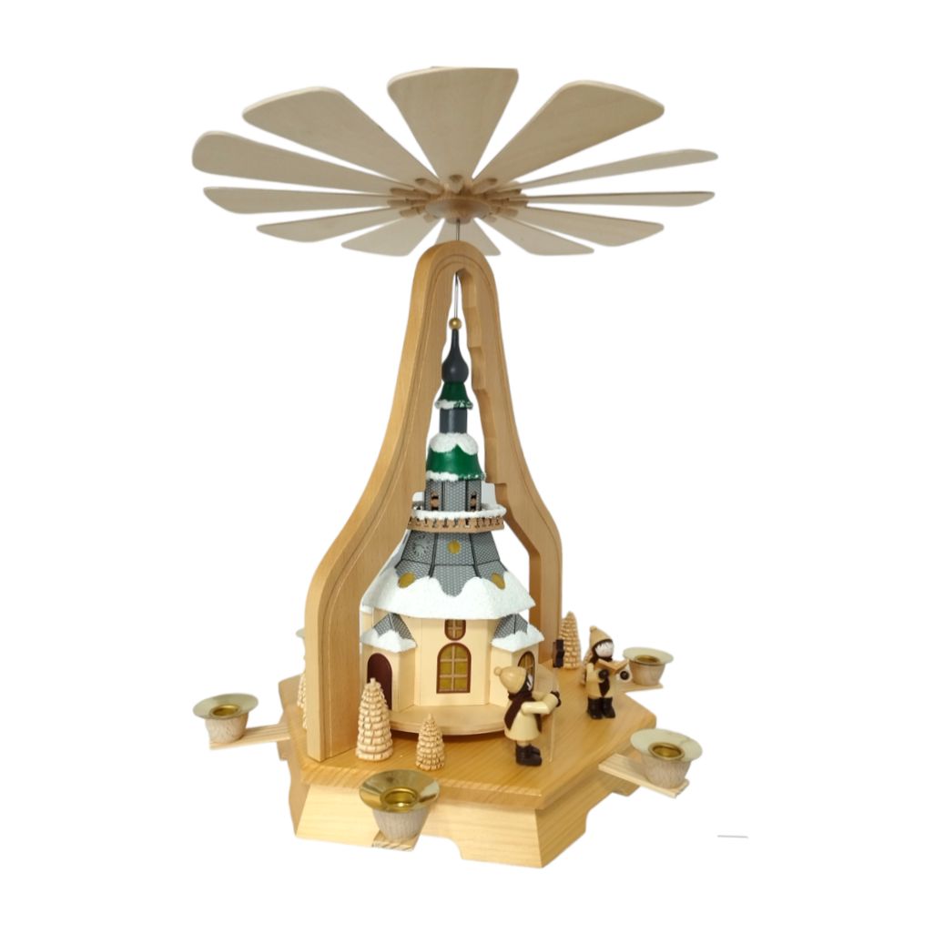 In liebevoller Handarbeit sowie einem Blick für Details stellt das Unternehmen ” Friedensbrücke-Erzgebirgische Kunstgewerbe und Spielwaren GmbH” diese Pyramide Seiffener Kirche mit Kurrende her.
