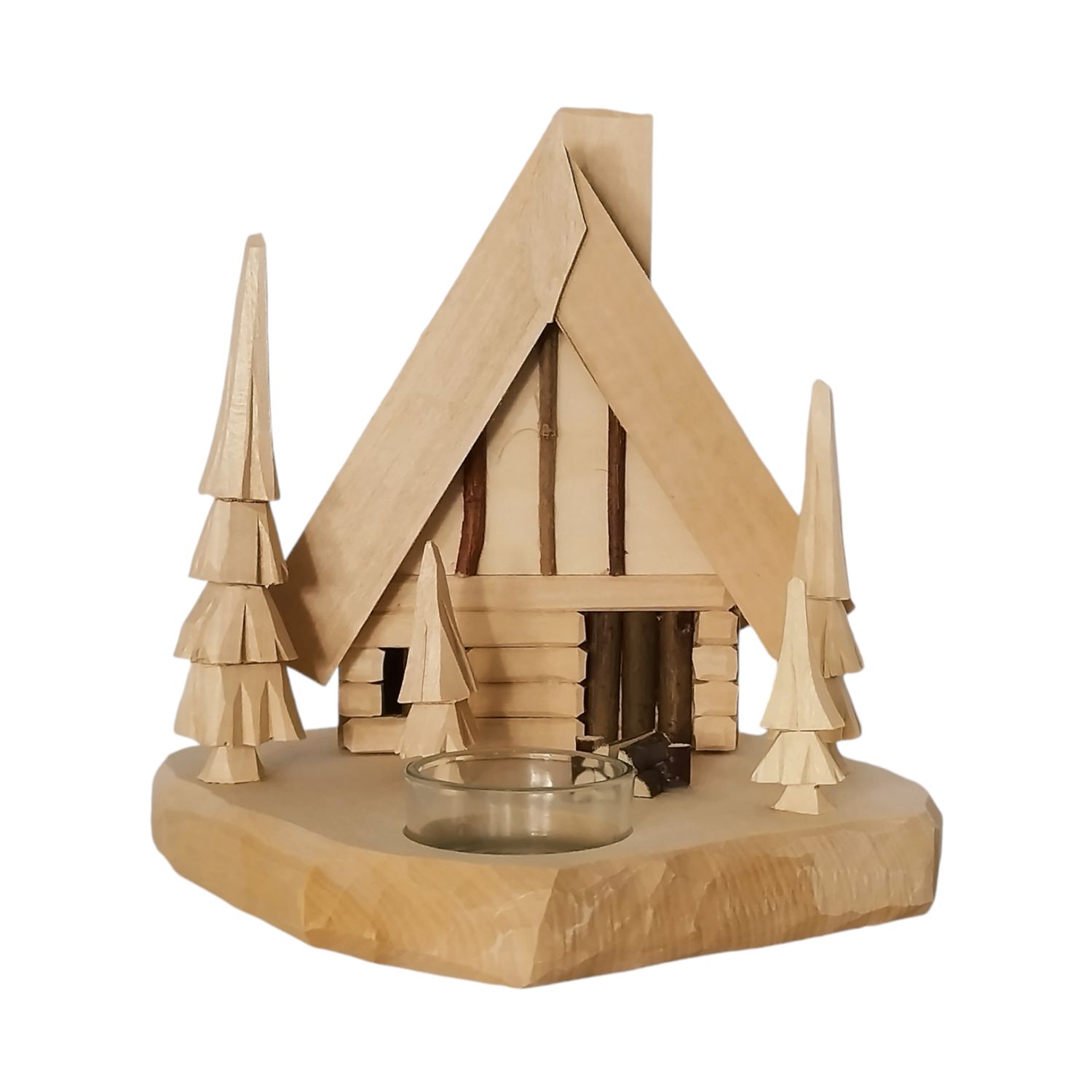Um die Hütte herum stehen derb geschnitzte Bäume. Diese Bäume erinnern an den typischen Wald und verstärken den urigen Charakter der Szene. Die Bäume sind, ebenso wie die Hütte, in Naturholzfarben gehalten und fügen sich nahtlos in das Gesamtbild ein.