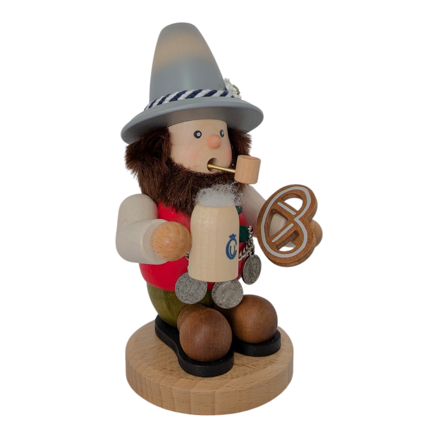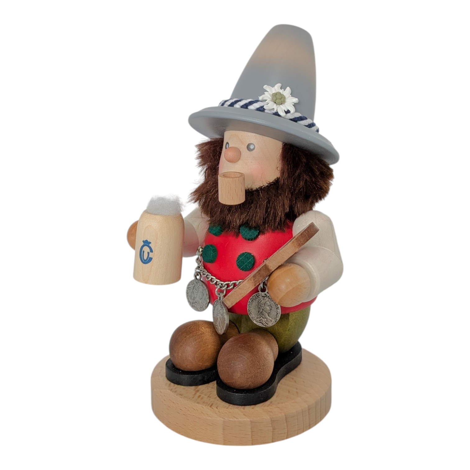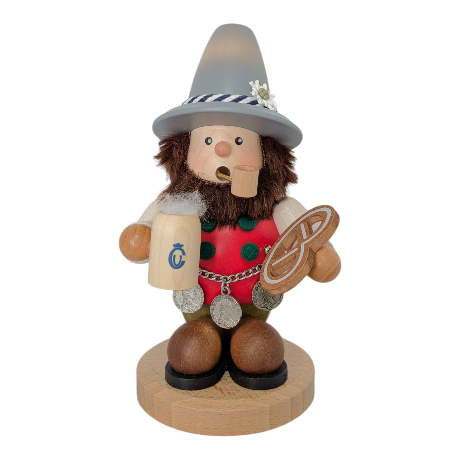 Sein Körper ist aus glattem Holz in leuchtendem Rot gefertigt und mit grünen Punkten verziert, passend zur fröhlichen Trachtenoptik. Als echter Genießer hält er stolz einen hölzernen Maßkrug mit schaumiger Krone in der einen Hand – das Ulbricht-Logo ziert den Krug als feines Detail. In der anderen Hand präsentiert er eine kunstvoll gedrechselte Brezel. Besonders liebevoll gestaltet ist die silberne Münzkette, die ihm quer über den Bauch hängt und mit drei detaillierten historischen Münzen verziert ist.