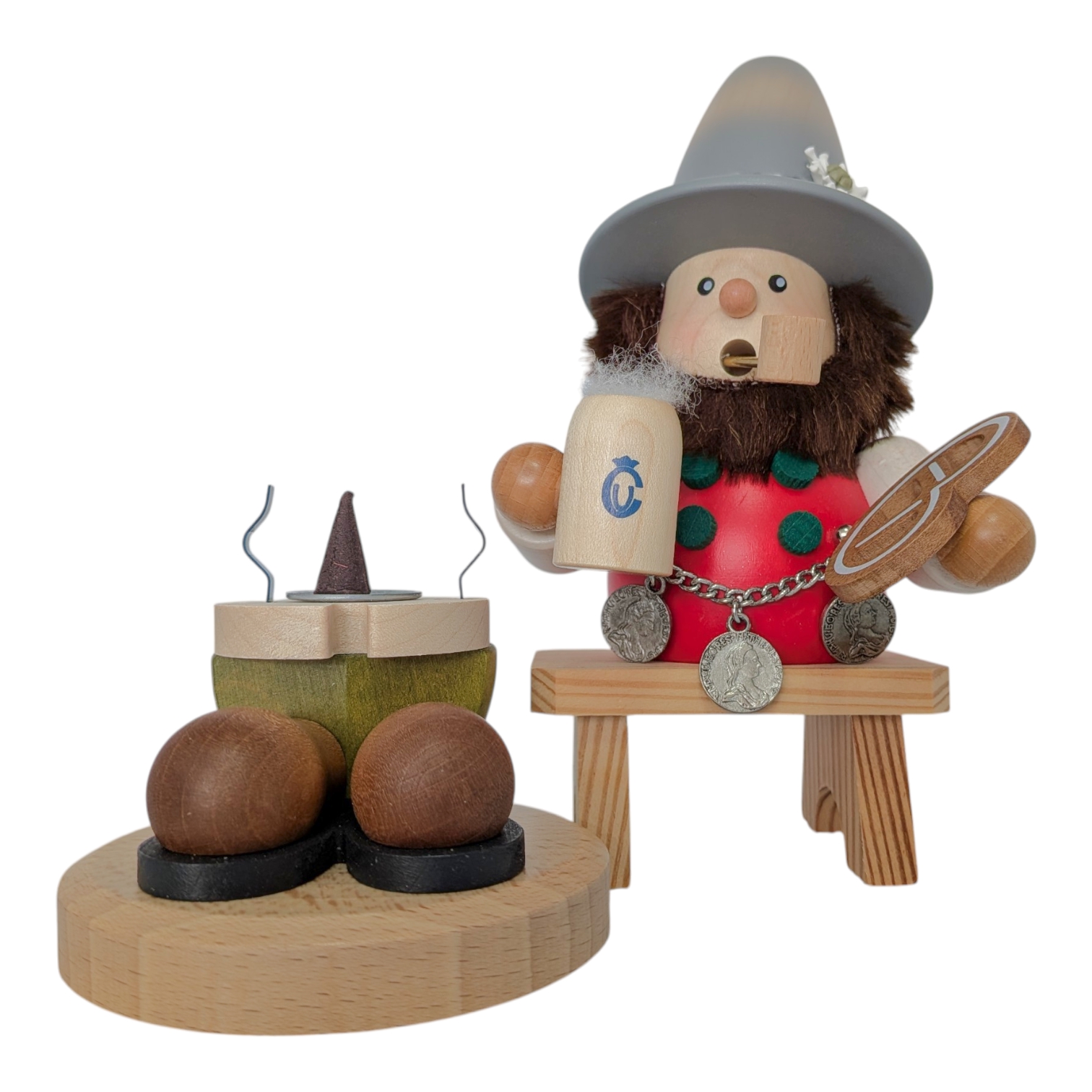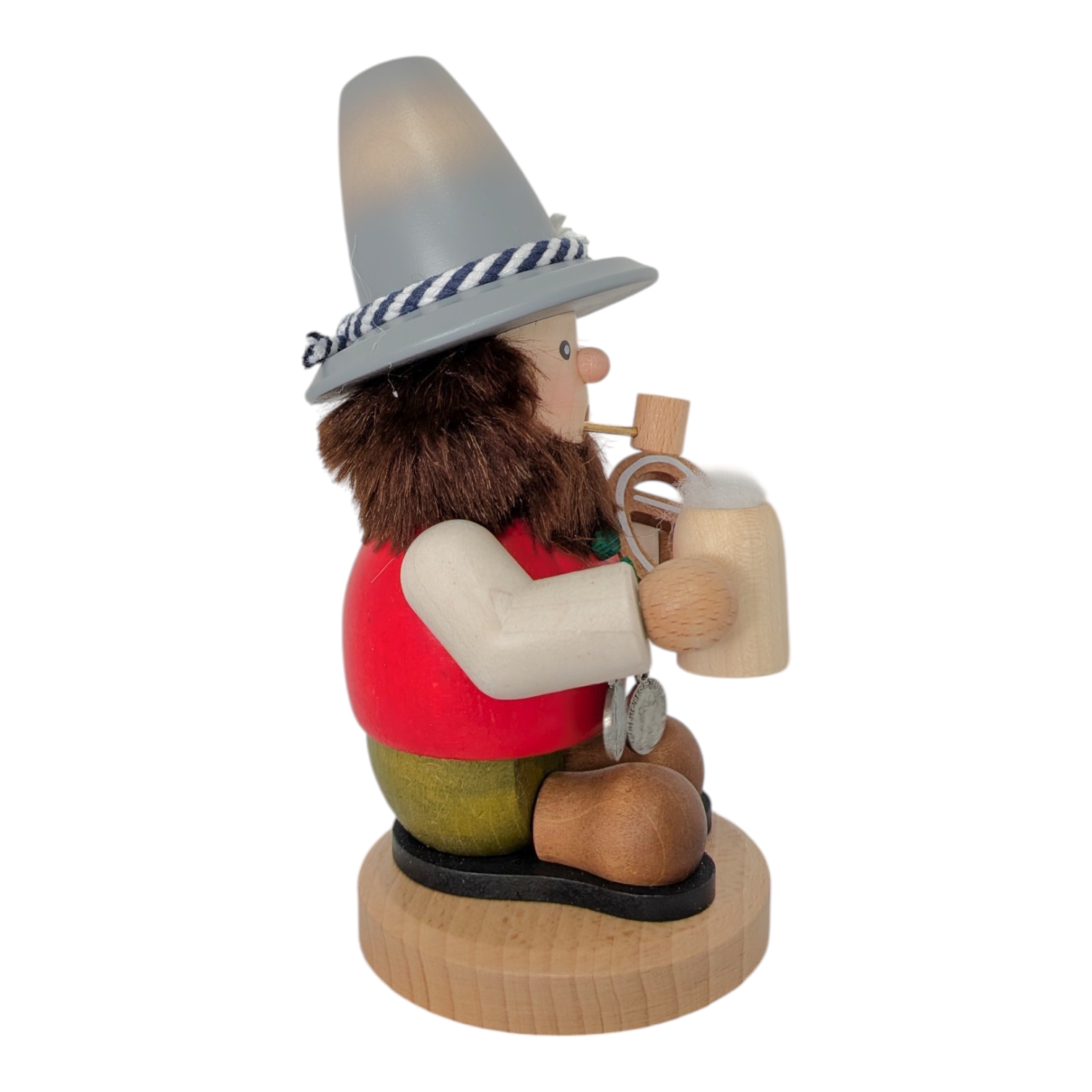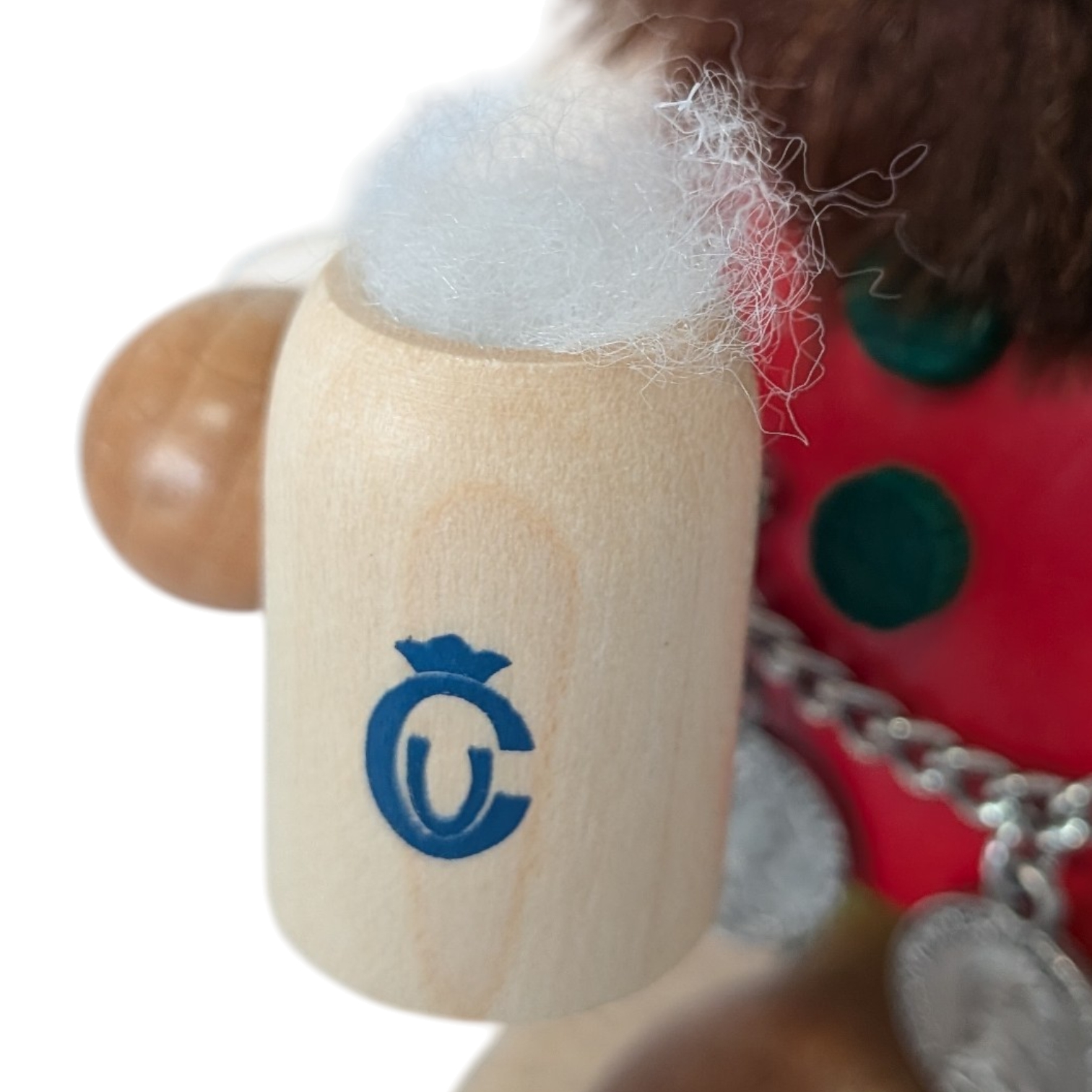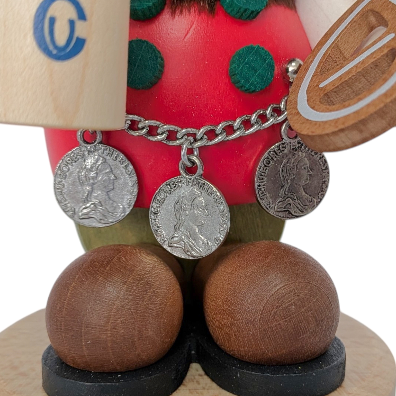 Sein Körper ist aus glattem Holz in leuchtendem Rot gefertigt und mit grünen Punkten verziert, passend zur fröhlichen Trachtenoptik. Als echter Genießer hält er stolz einen hölzernen Maßkrug mit schaumiger Krone in der einen Hand – das Ulbricht-Logo ziert den Krug als feines Detail. In der anderen Hand präsentiert er eine kunstvoll gedrechselte Brezel. Besonders liebevoll gestaltet ist die silberne Münzkette, die ihm quer über den Bauch hängt und mit drei detaillierten historischen Münzen verziert ist.