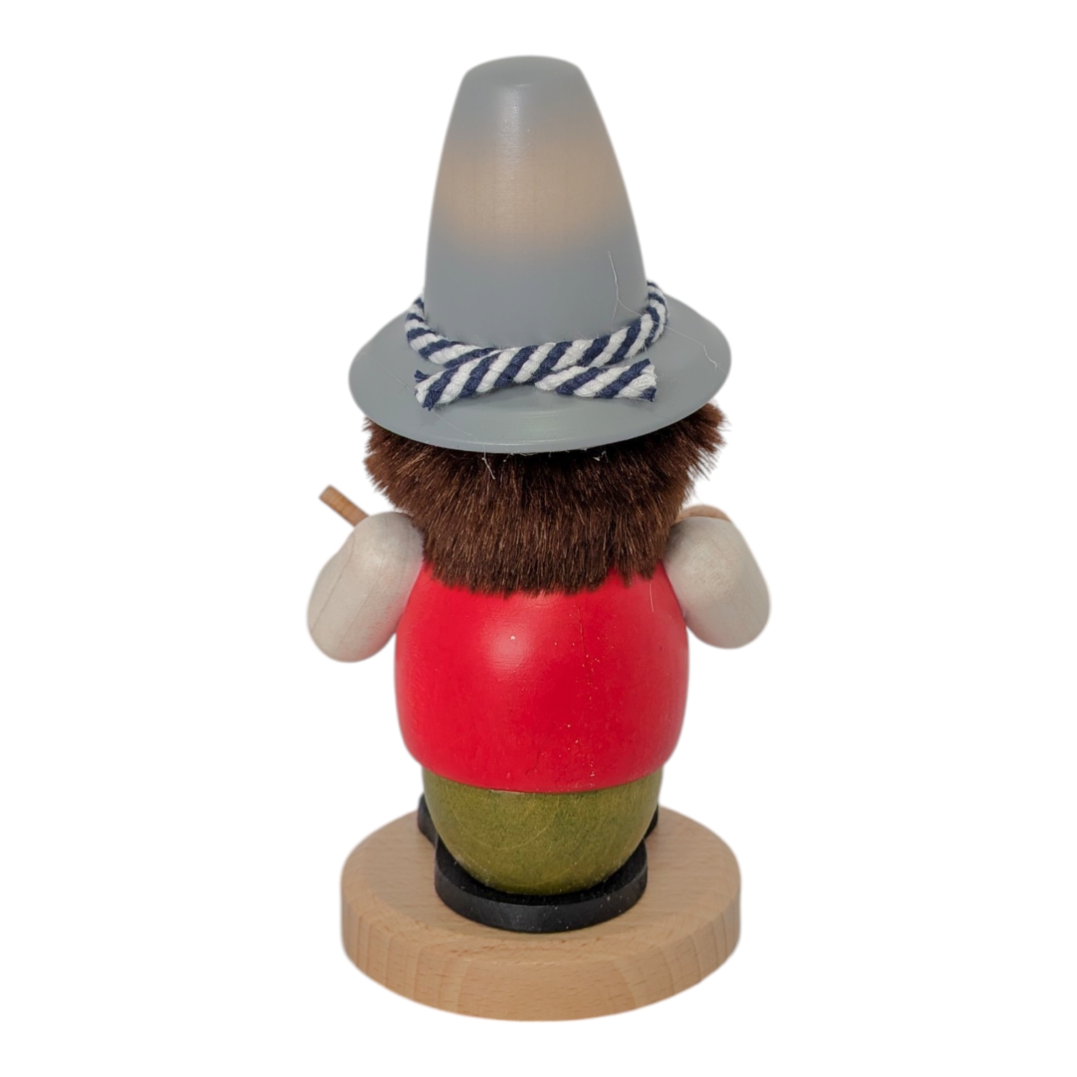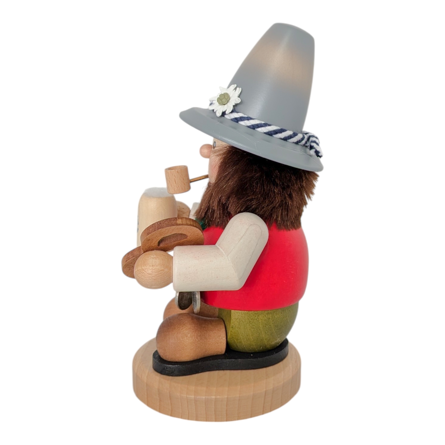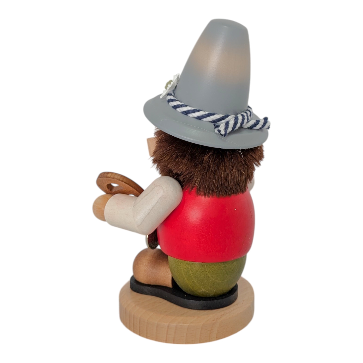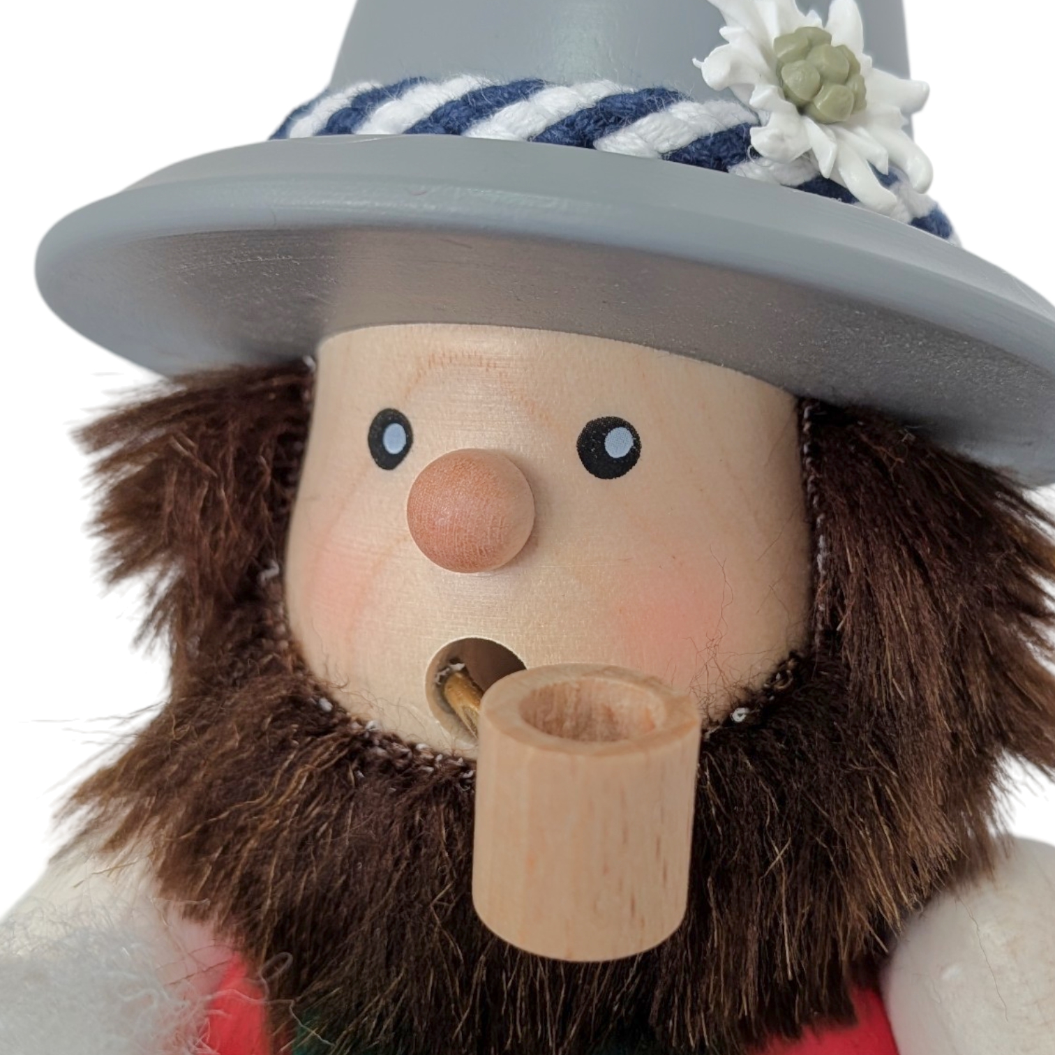 Das Gesicht des Bayer ist freundlich und verbreitet sofort eine zünftige bayerische Stimmung. Seine kleinen, schwarzen Augen blicken aufgeweckt in die Welt, während die rosigen Wangen und das verschmitzte Lächeln seine Lebendigkeit betonen. Wie bei den klassischen Ulbricht Räuchermännern üblich, gibt ihm das wilde, braune Haar sowie der buschige Bart ein uriges sowie überaus sympathisches Aussehen. Er trägt einen markanten, grauen Trachtenhut mit breiter Krempe, einem blau-weiß geflochtenen Hutband und einer zarten weißen Edelweißblüte – ein echter Bayer durch und durch.