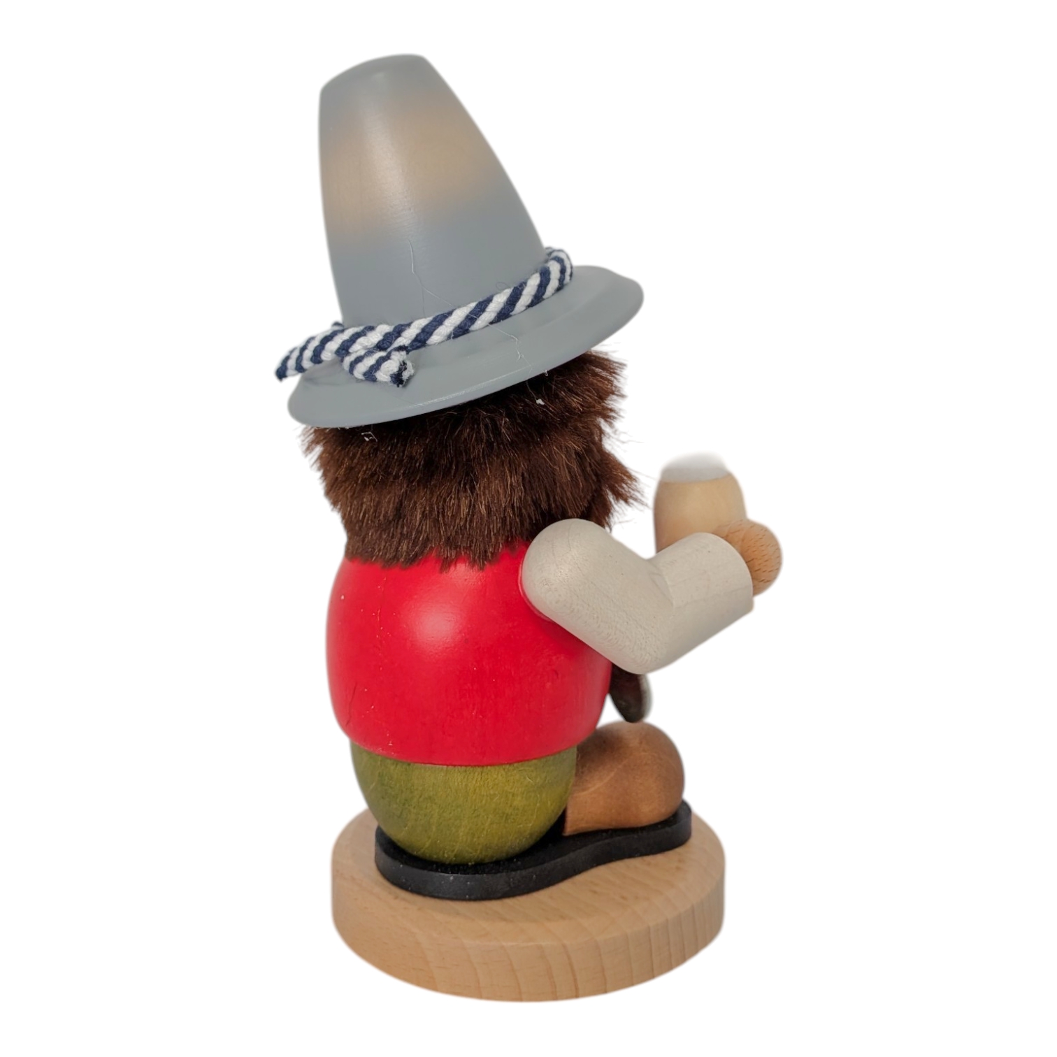 Die kurzen Beine sowie die massiven, dunkelbraunen Schuhe sorgen für einen stabilen Stand und runden das farblich harmonische Gesamtbild ab. Neben seiner dekorativen Funktion ist der Bayer ein echter Räuchermann: Im Inneren findet ein Räucherkerzchen Platz, dessen Rauch durch den offenen Mund aufsteigt und der Figur so auf traditionelle Weise Leben einhaucht. Dieser Bayer verbindet erzgebirgische Handwerkskunst mit humorvollem, bayerischem Flair und ist ein ideales Geschenk für Liebhaber hochwertiger Holzkunst sowie Bayern-Fans gleichermaßen.