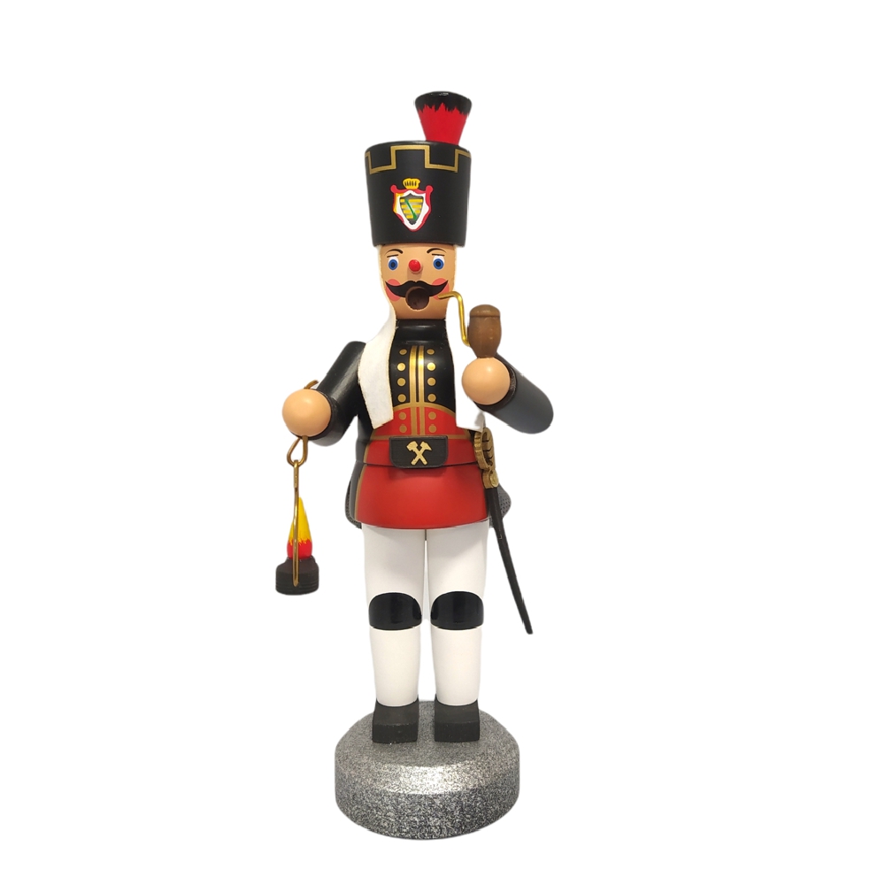 Die schicke Uniform des Bergmanns ist liebevoll sowie aufwendig mit goldenen Akzenten verziert, auf seinem Hut prangt das sächsische Wappen. Mit schwarzen Schuhen steht er fest auf seinem Podest welches farblich an funkelndes Erz erinnert. Sein freundliches Gesicht mit den großen blauen Augen, der roten Knollennase sowie rosa Wangen wird von einem schwarzen Schnauzbart geziert. In Händen hält er ganz traditionell seine Pfeife sowie ein brennendes Grubenlicht, sein Säbel steckt in der Scheide an seinem Gürtel. Das Oberteil des Bergmanns lässt sich ganz einfach vom Unterteil lösen um die Räucherfigur mit Räucherkerzen bestücken zu können.