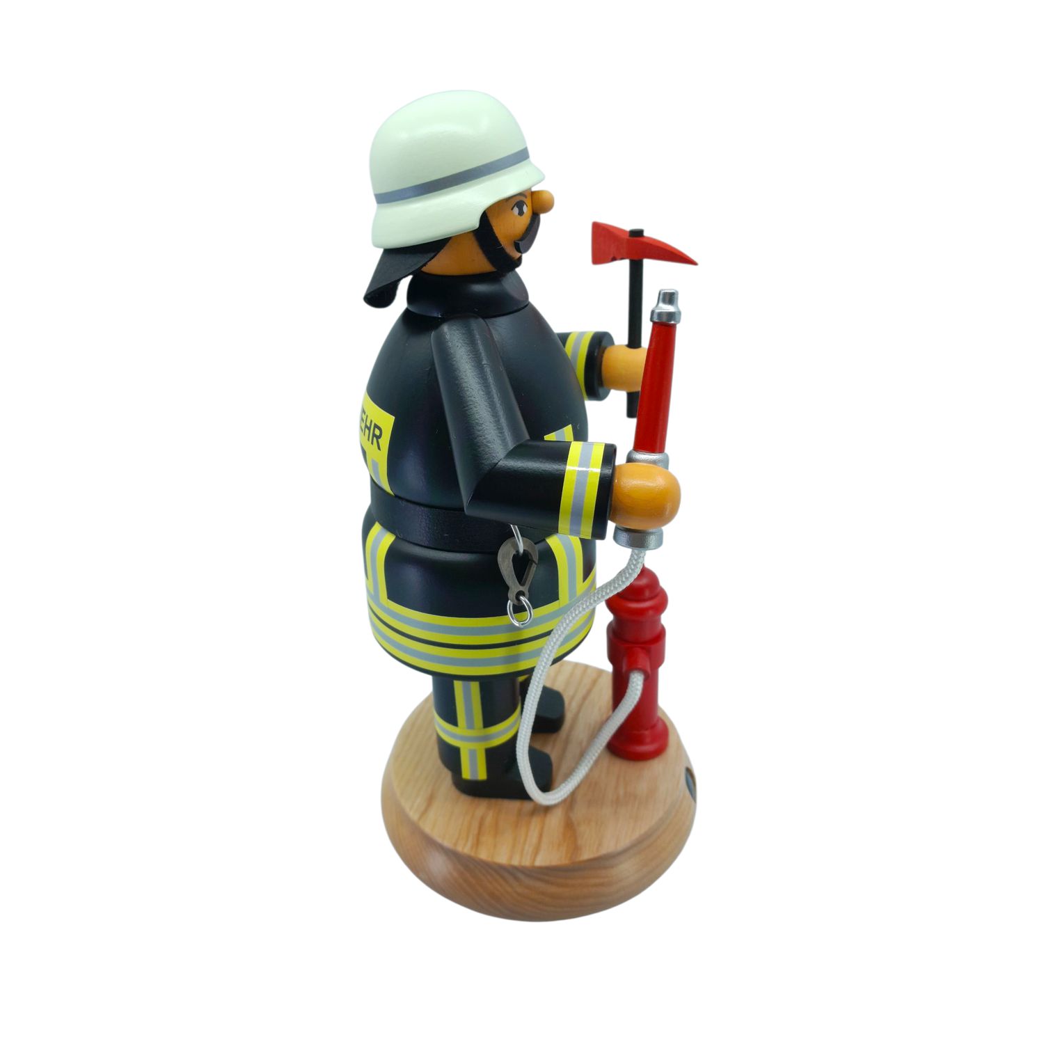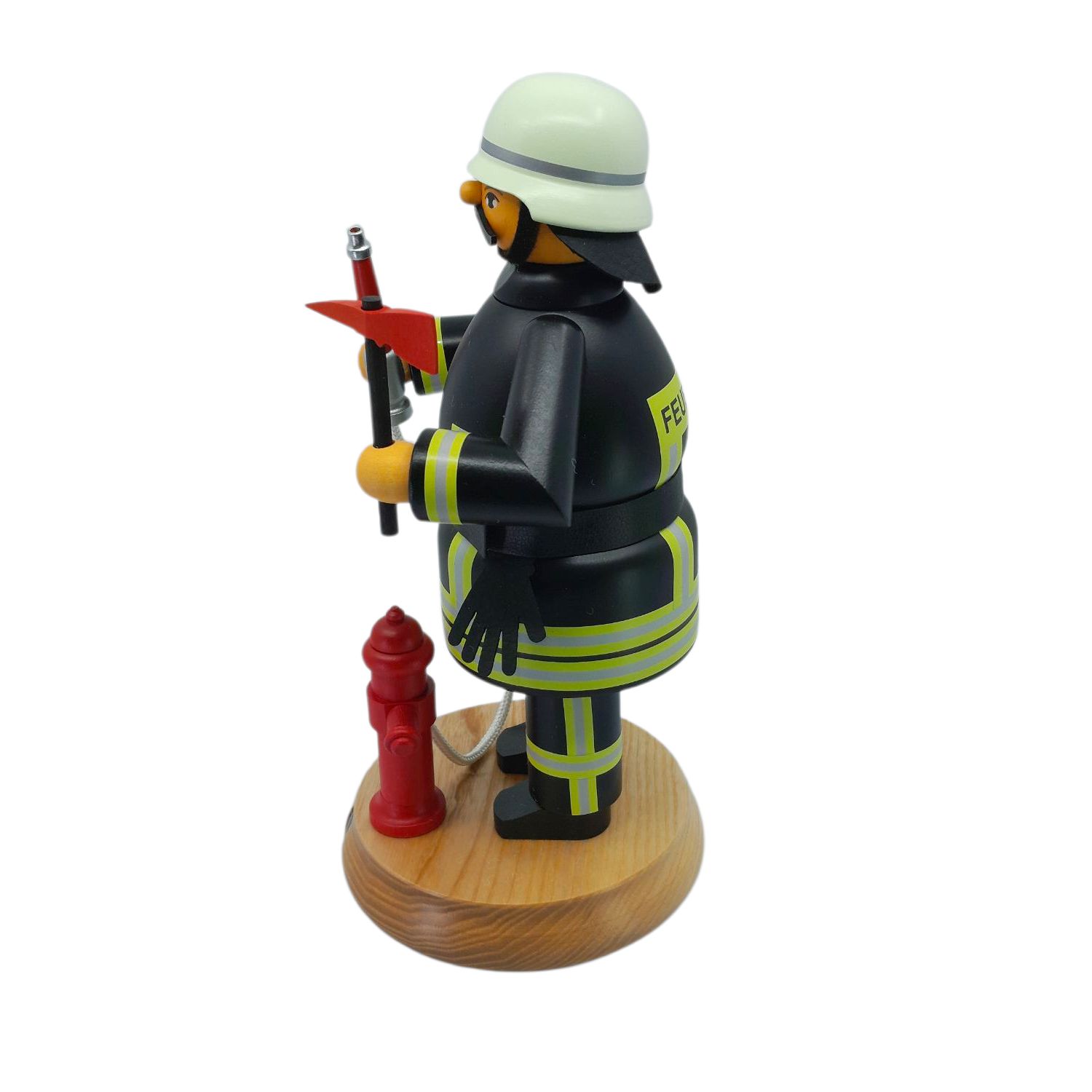 In der rechten Hand hält der Feuerwehrmann eine kleine rote Axt, ein unverzichtbares Werkzeug im Einsatz, das sowohl symbolisch als auch praktisch für die Arbeit eines Feuerwehrmanns steht. In der linken Hand hat er einen Feuerwehrschlauch, der mit einer silbernen Düse endet. Dieser Schlauch ist mit einem roten Hydranten verbunden, der auf dem runden, hellen Holzsockel der Figur montiert ist. Der Hydrant und der Schlauch unterstreichen die Einsatzbereitschaft und die typische Ausrüstung eines Feuerwehrmanns.