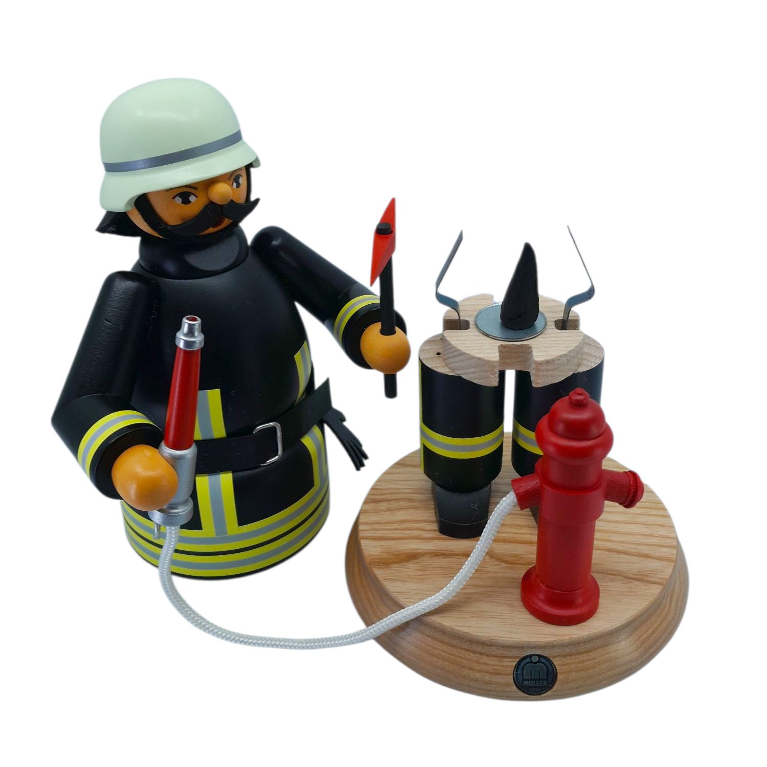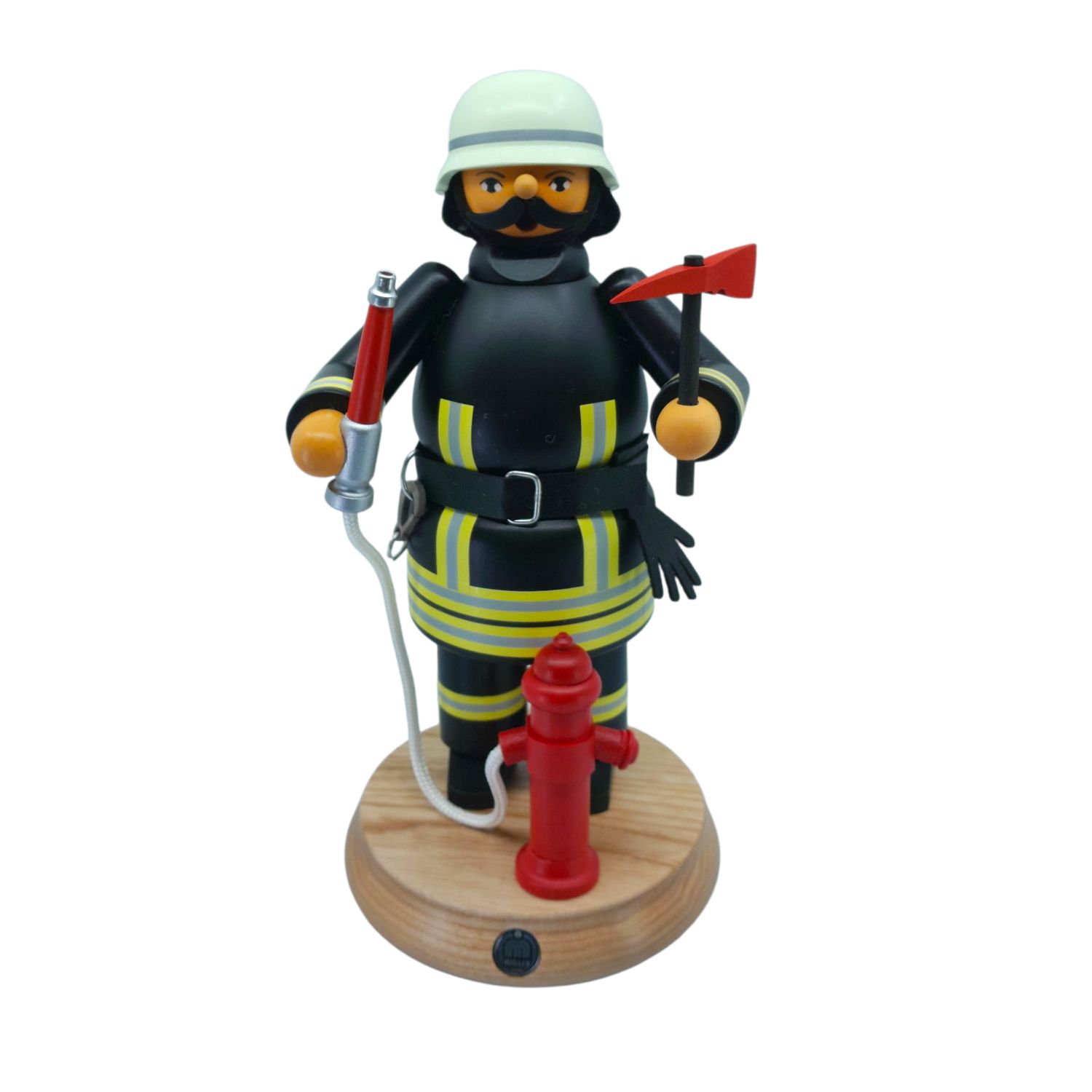 Aus dem Hause Müller kommt dieser Räuchermann Feuerwehrmann, schwarz, hergestellt in traditioneller Handarbeit aus heimischen Hölzern und in kräftigen Farben von Hand gebeizt sowie bemalt.
