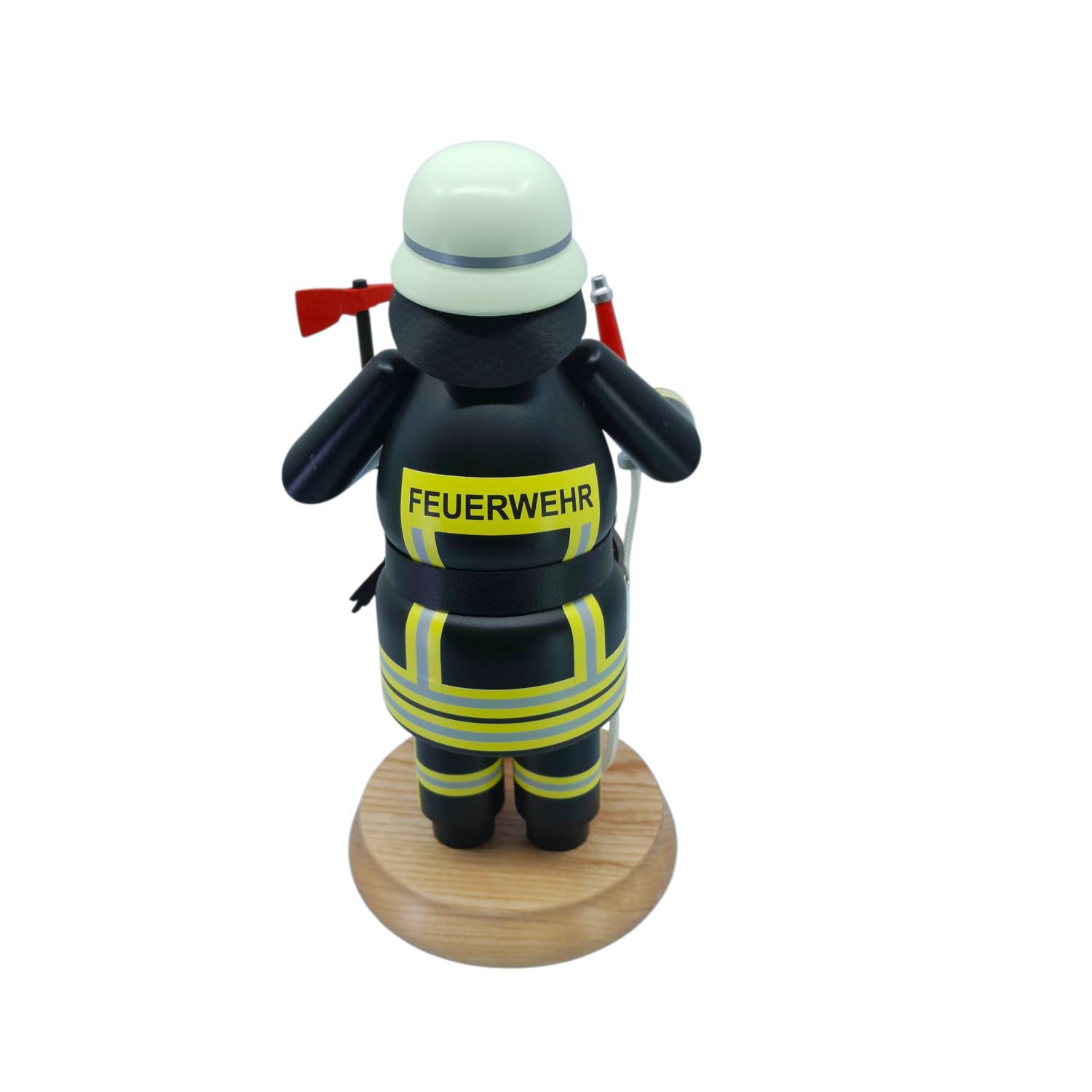 Auf dem Kopf trägt die Figur einen weißen Helm, der ebenfalls mit einem schwarzen Streifen um die Krempe verziert ist. Dieser Helm ist ein typisches Merkmal der traditionellen Feuerwehruniform und bietet Schutz bei gefährlichen Einsätzen.
