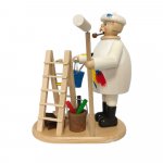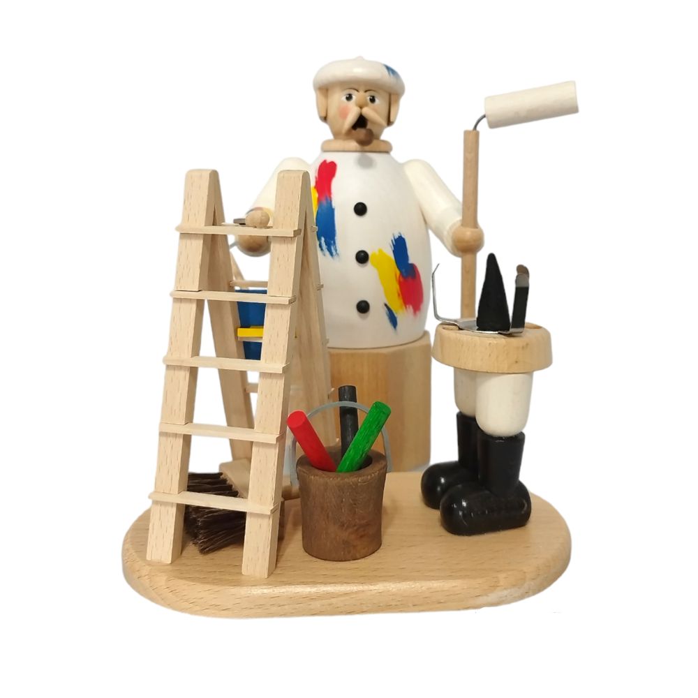 Mit schwarzen Stiefeln steht der Räuchermann Maler auf einem kleinen Podest. Gekleidet ist er in weißer Malerkluft die am Bauch von schwarzen Knöpfen zusammengehalten wird, einem weißen Hut sowie hellen Hosen.