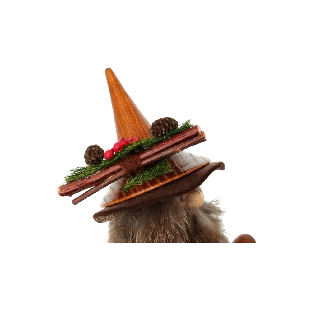 Unser Räuchermann Pilzsammler ist ein wahres Meisterwerk der erzgebirgischen Holzkunst. In natürlichen Erdtönen gehalten, strahlt er eine warme und gemütliche Atmosphäre aus. Sein Spitzhut ist kunstvoll mit den Früchten des Waldes verziert und in einem tiefen Braunton gehalten.