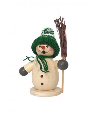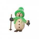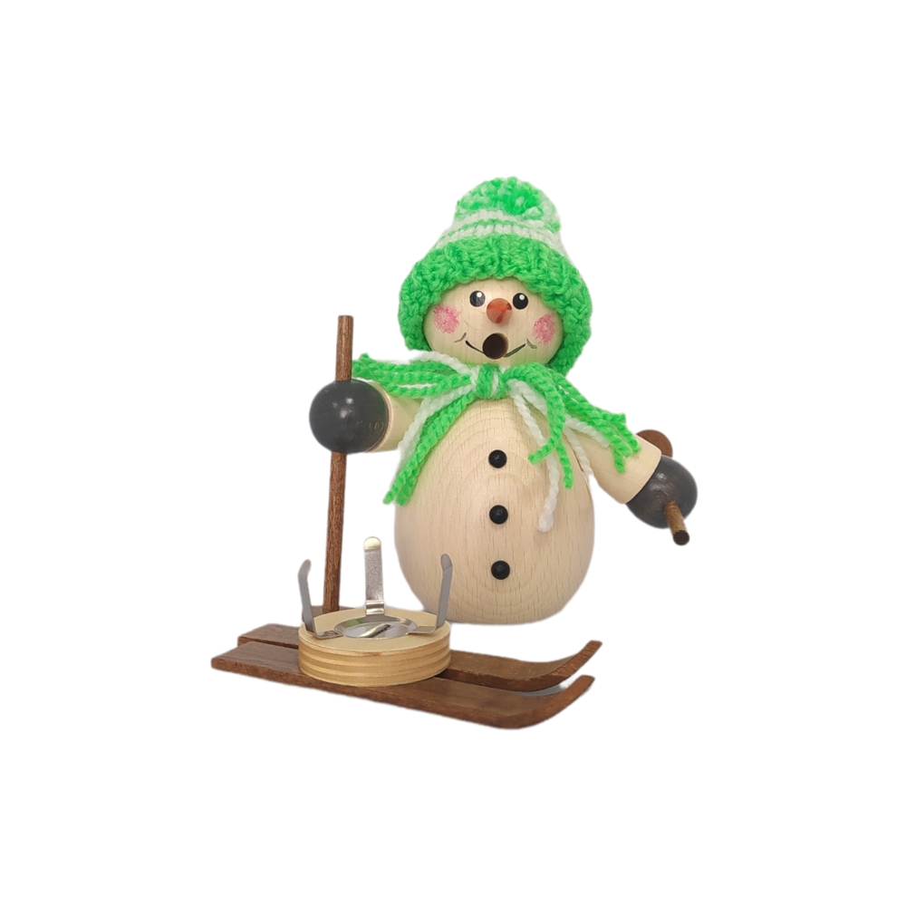 Liebevoll sowie aufwendig gestalteter Räuchermann Schneemann mit grüner Mütze und Ski aus dem Hause Holzwaren Egermann. Hergestellt in traditioneller sowie detailreicher Handarbeit.