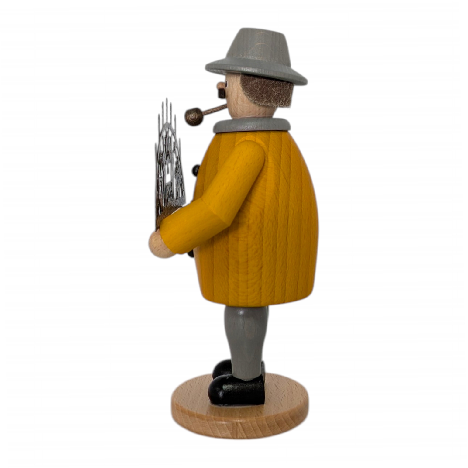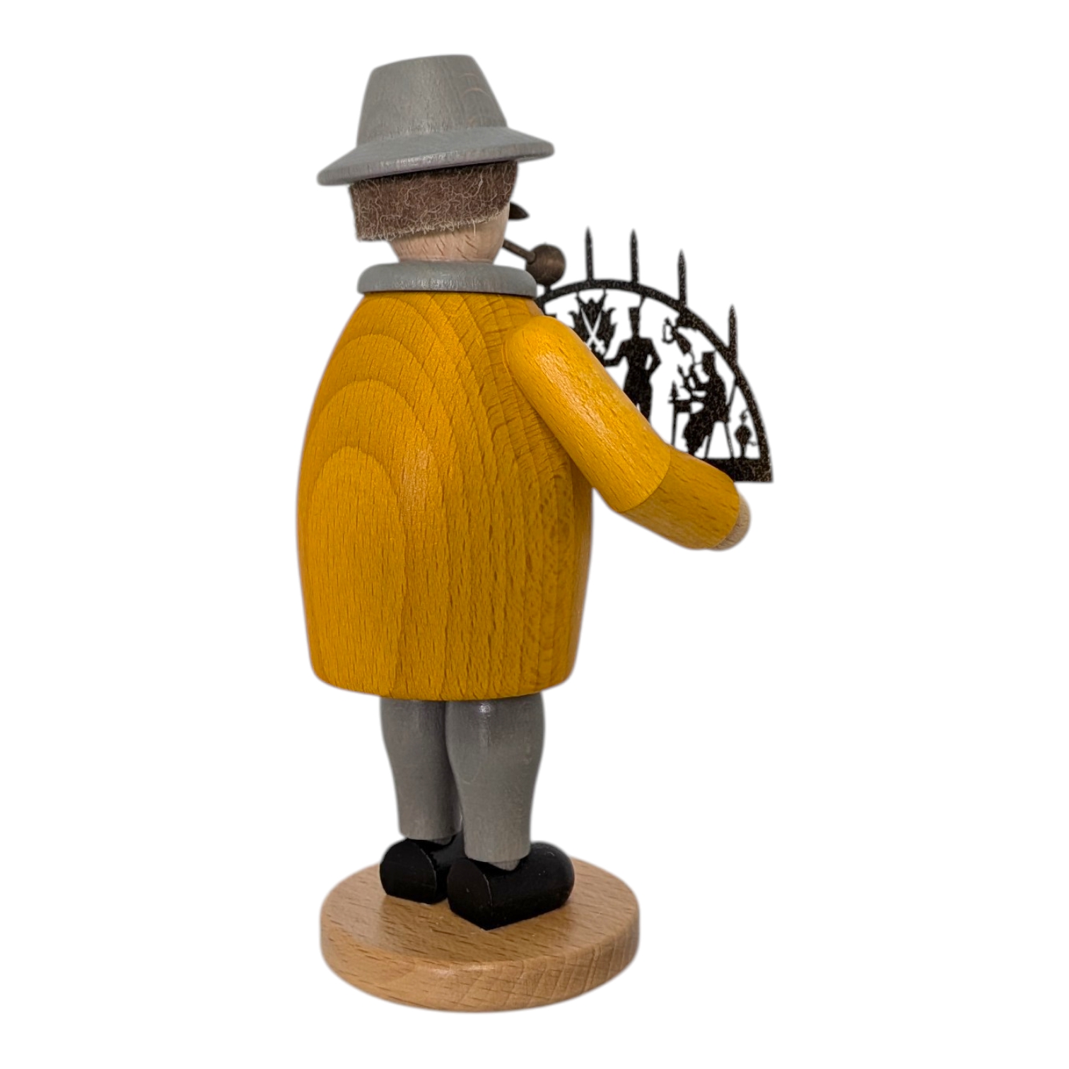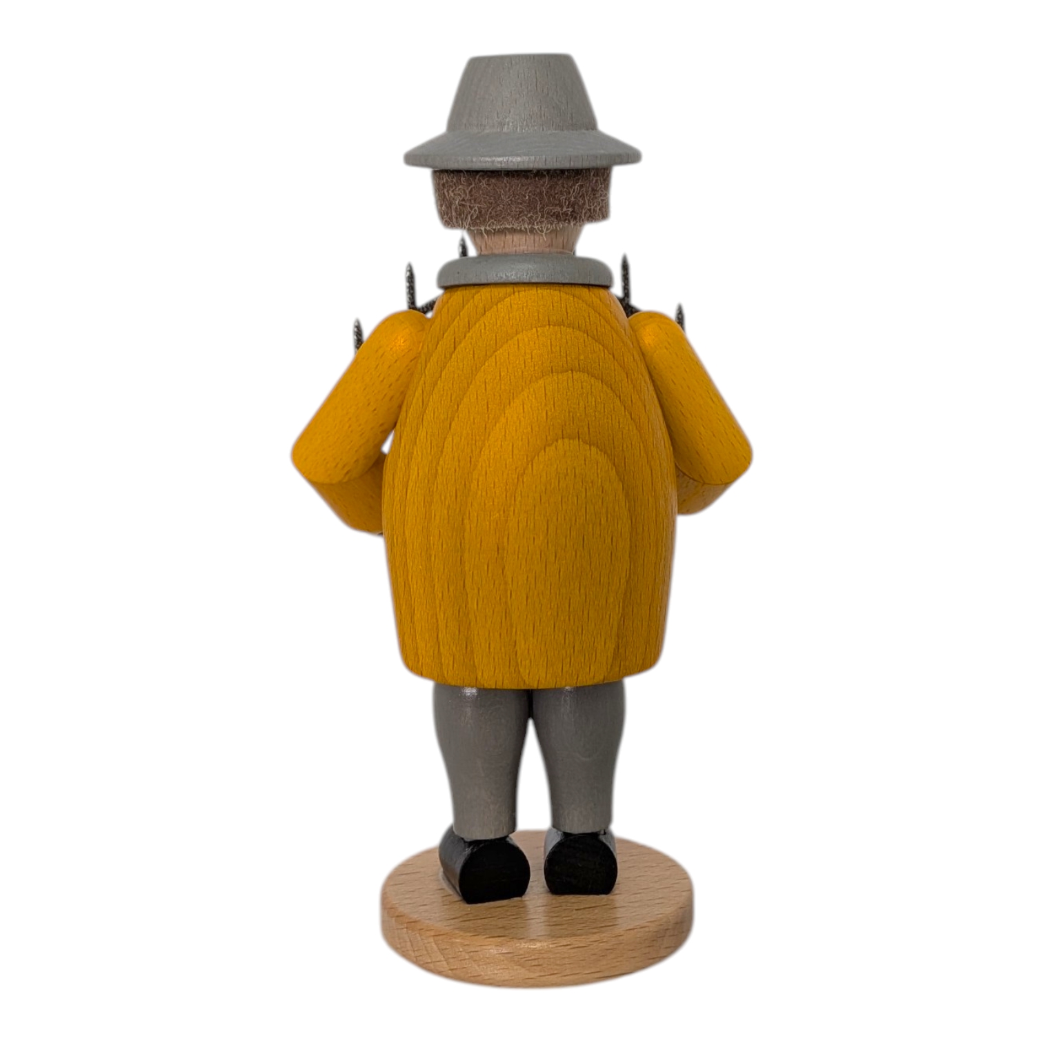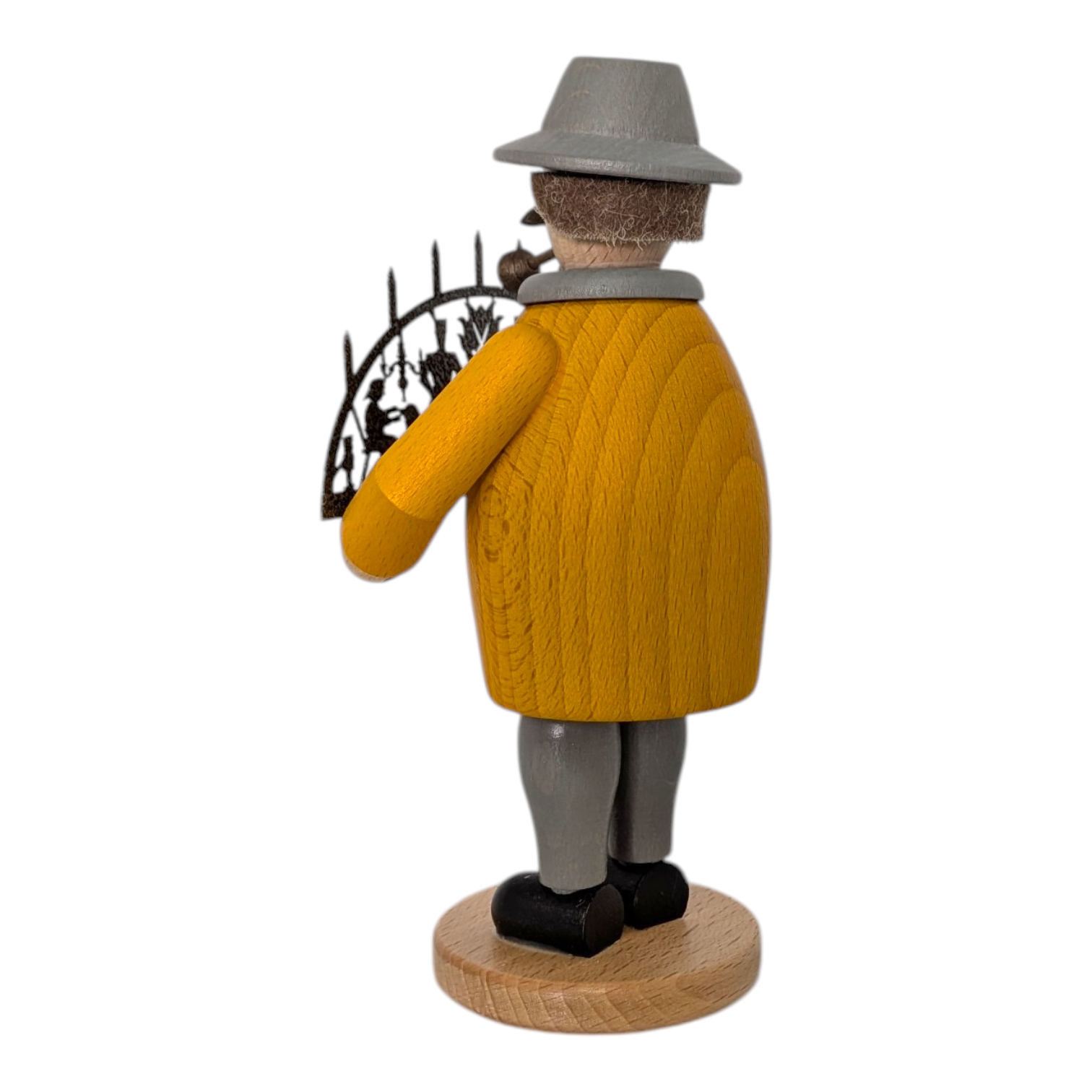 Gekleidet in einen warmen, leuchtend gelben Mantel steht die Figur aufrecht auf einem runden, naturhellen Holzpodest. Die kräftige gelbe Jacke, in sattem Senfton gehalten, lässt die Maserung des heimischen Holzes wunderschön durchscheinen und verleiht dem Räuchermann seinen unverwechselbaren, warmen Charakter. Graue Hose und solide schwarze Schuhe runden das bodenständige Erscheinungsbild stimmig ab.