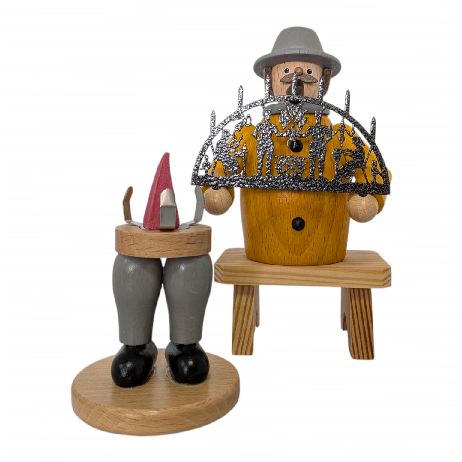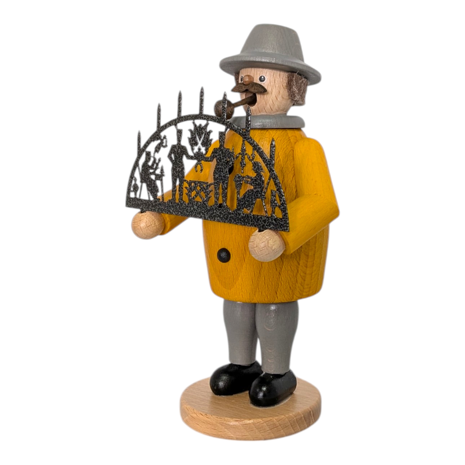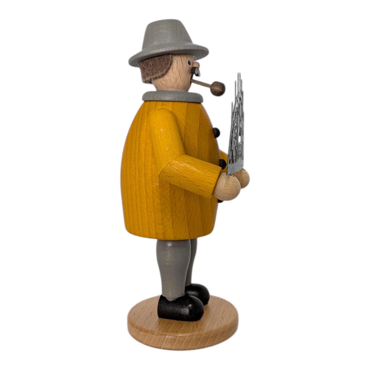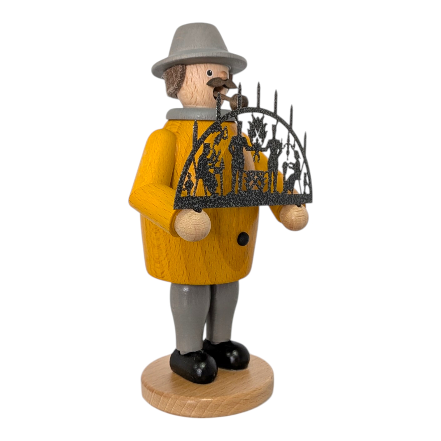 Gekleidet in einen warmen, leuchtend gelben Mantel steht die Figur aufrecht auf einem runden, naturhellen Holzpodest. Die kräftige gelbe Jacke, in sattem Senfton gehalten, lässt die Maserung des heimischen Holzes wunderschön durchscheinen und verleiht dem Räuchermann seinen unverwechselbaren, warmen Charakter. Graue Hose und solide schwarze Schuhe runden das bodenständige Erscheinungsbild stimmig ab.