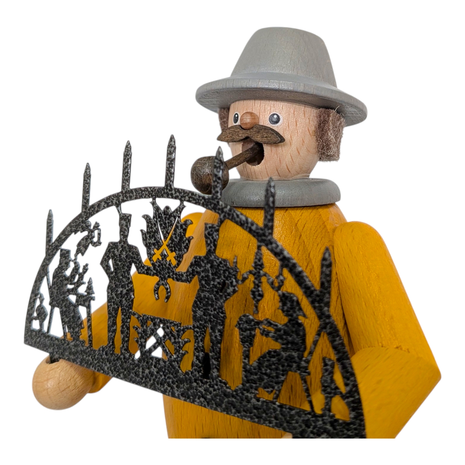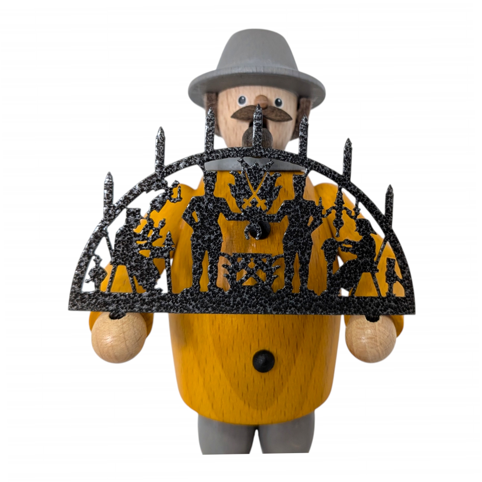 Das eigentliche Highlight dieser Figur ist der kunstvoll gearbeitete Schwibbogen aus dunklem Metall, den der Räuchermann stolz in beiden Händen hält. Der reich verzierte Bogen zeigt typisch erzgebirgische Motive – Handwerker, Bergleute und weihnachtliche Szenen – und ist ein Sinnbild für die tiefe Verbundenheit dieser Region mit Licht, Tradition und Gemeinschaft.