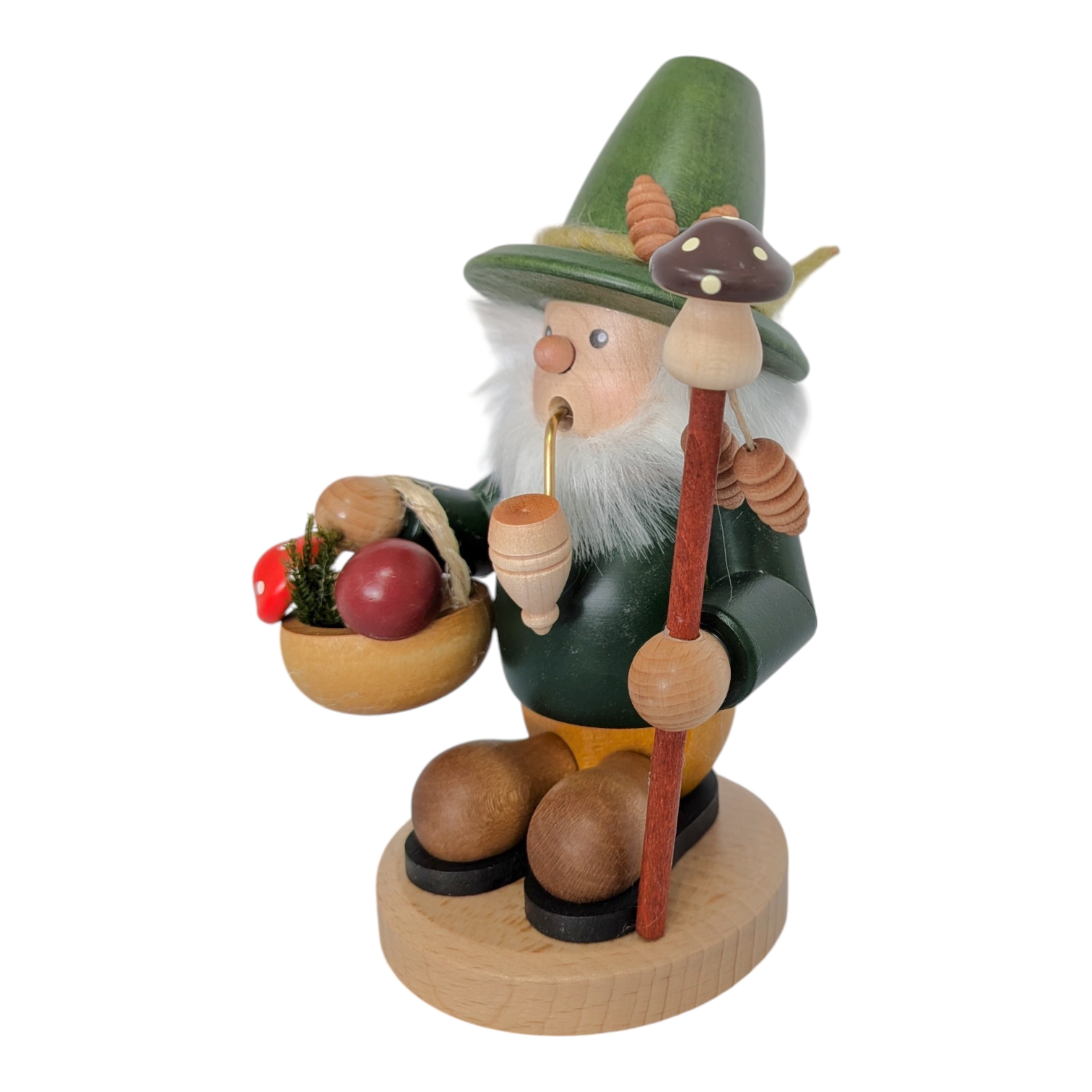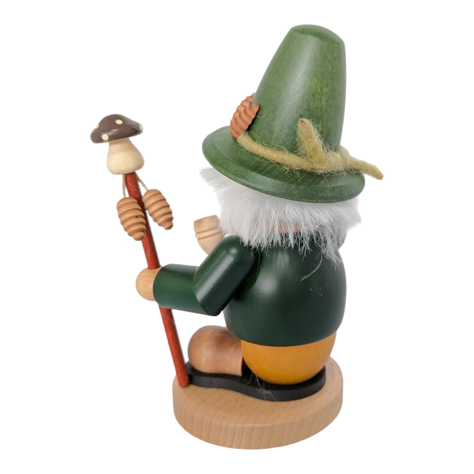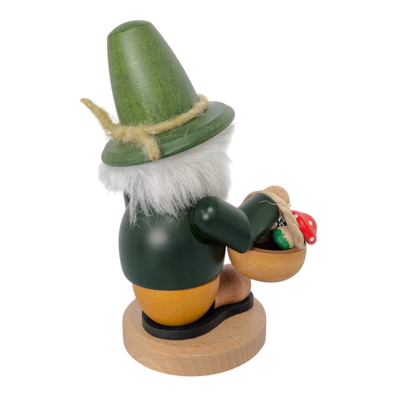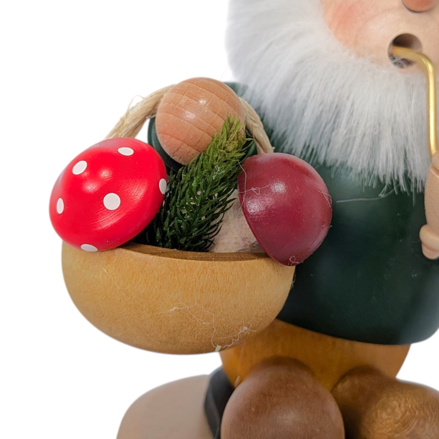 Sein Körper ist aus glattem Holz in sattem Waldgrün gefertigt, passend zu seiner naturverbundenen Erscheinung. In den Händen trägt er stolz die Begleiter eines jeden Pilzsammlers: In der einen Hand hält er fest einen hölzernen Wanderstock, der mit einem kunstvoll gedrechselten Pilz an der Spitze und weiteren Holzperlen verziert ist – ein wahrer Blickfang. In der anderen trägt er ein prall gefülltes Holzkörbchen, reich befüllt mit den Schätzen des Waldes: ein leuchtend roter Fliegenpilz mit weißen Punkten, ein Tannenzweig, eine dunkelrote Beere und eine Eichel lugen bereits neugierig heraus.