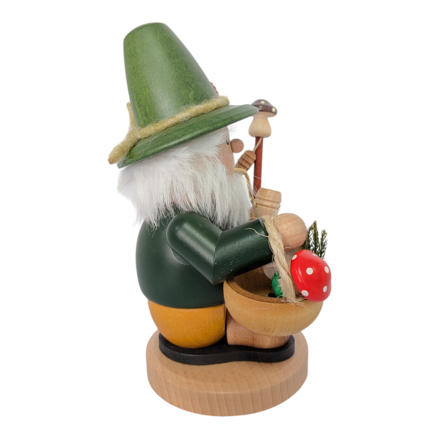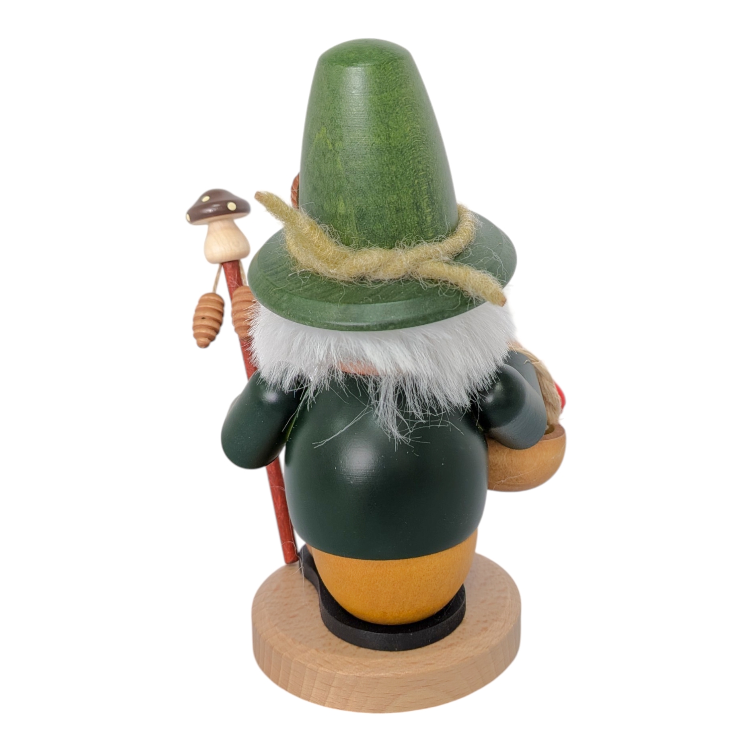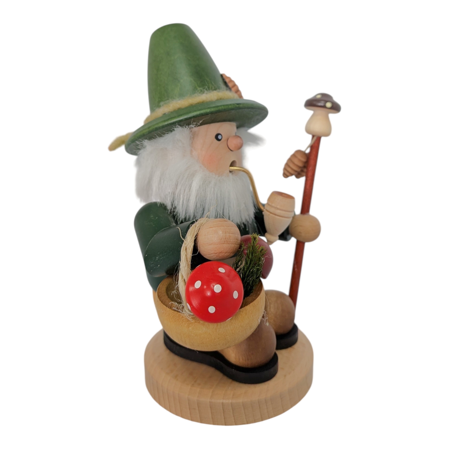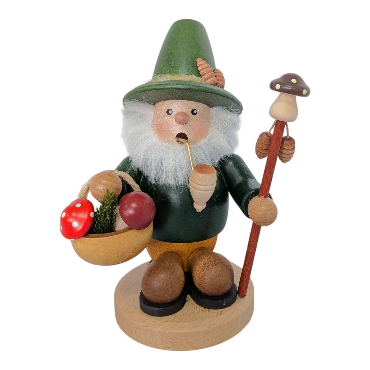 Sein Körper ist aus glattem Holz in sattem Waldgrün gefertigt, passend zu seiner naturverbundenen Erscheinung. In den Händen trägt er stolz die Begleiter eines jeden Pilzsammlers: In der einen Hand hält er fest einen hölzernen Wanderstock, der mit einem kunstvoll gedrechselten Pilz an der Spitze und weiteren Holzperlen verziert ist – ein wahrer Blickfang. In der anderen trägt er ein prall gefülltes Holzkörbchen, reich befüllt mit den Schätzen des Waldes: ein leuchtend roter Fliegenpilz mit weißen Punkten, ein Tannenzweig, eine dunkelrote Beere und eine Eichel lugen bereits neugierig heraus.