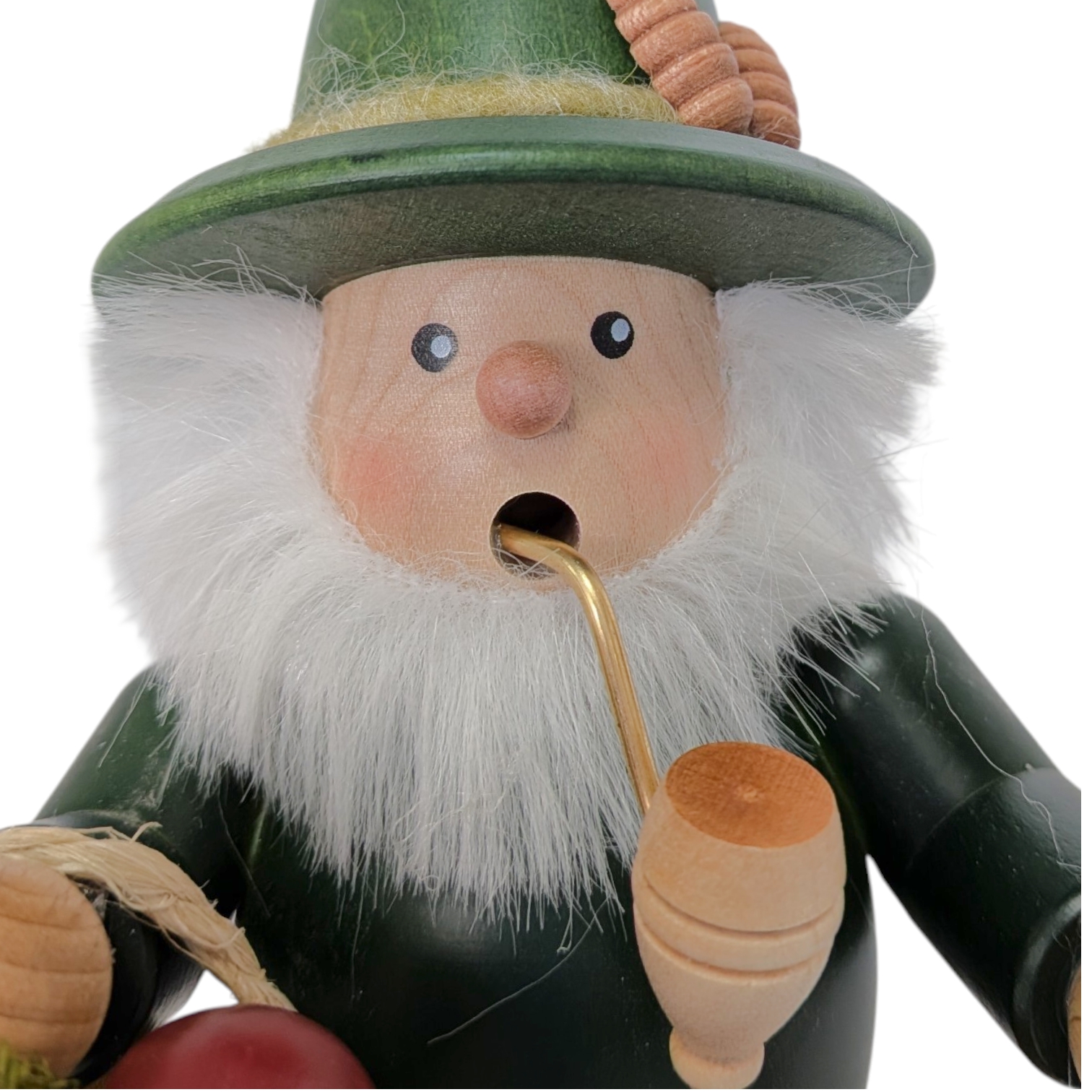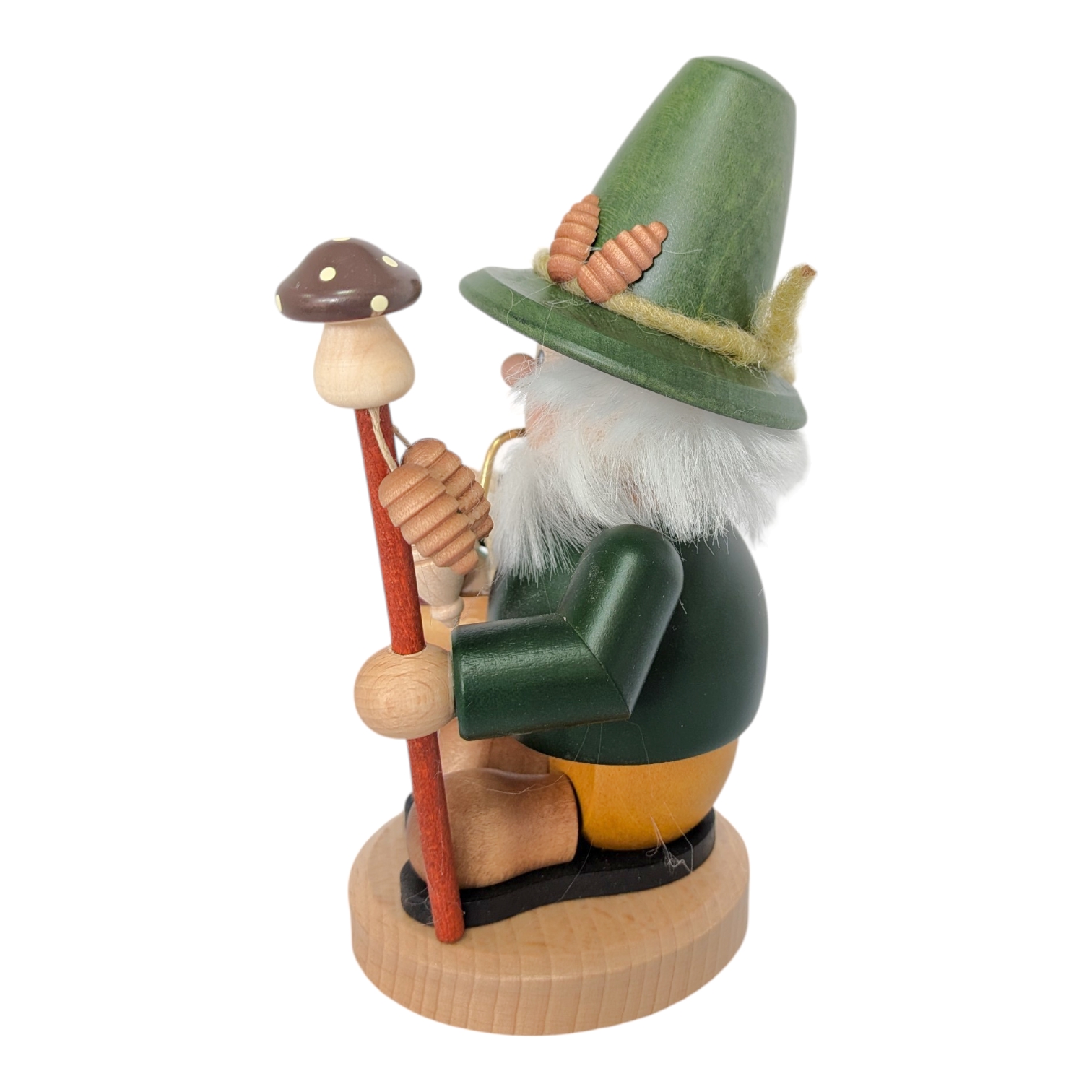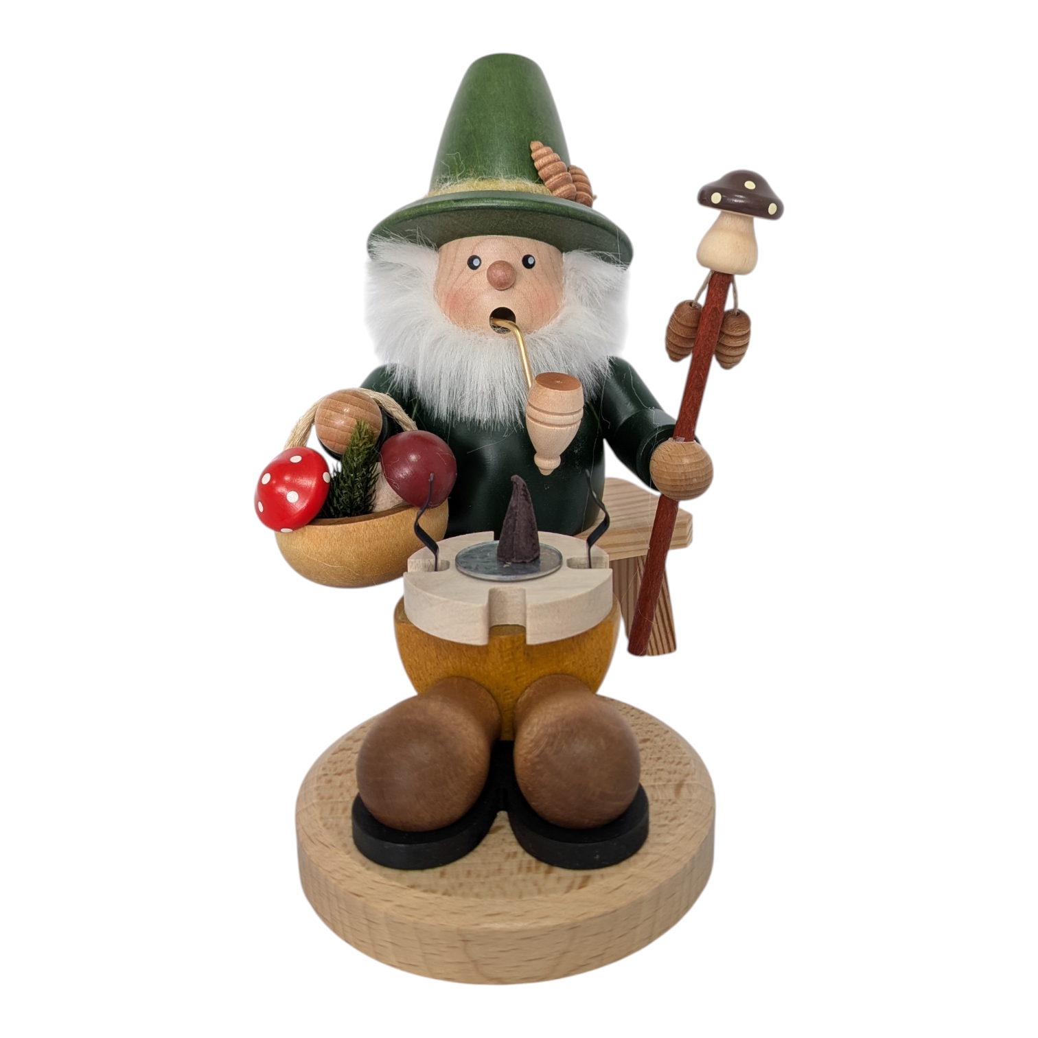 Die kurzen Beine sowie die massiven, dunkelbraunen Schuhe sorgen für einen stabilen Stand und runden das farblich harmonische Gesamtbild ab. Neben seiner dekorativen Funktion ist der Waldmann ein echter Räuchermann: Im Inneren findet ein Räucherkerzchen Platz, dessen Rauch durch den offenen Mund aufsteigt und der Figur so auf traditionelle Weise Leben einhaucht. Dieser Waldmann verbindet erzgebirgische Tradition mit humorvollem, naturnahem Design und ist ein ideales Geschenk für Naturfreunde, Pilzsammler und Liebhaber hochwertiger Holzkunst.