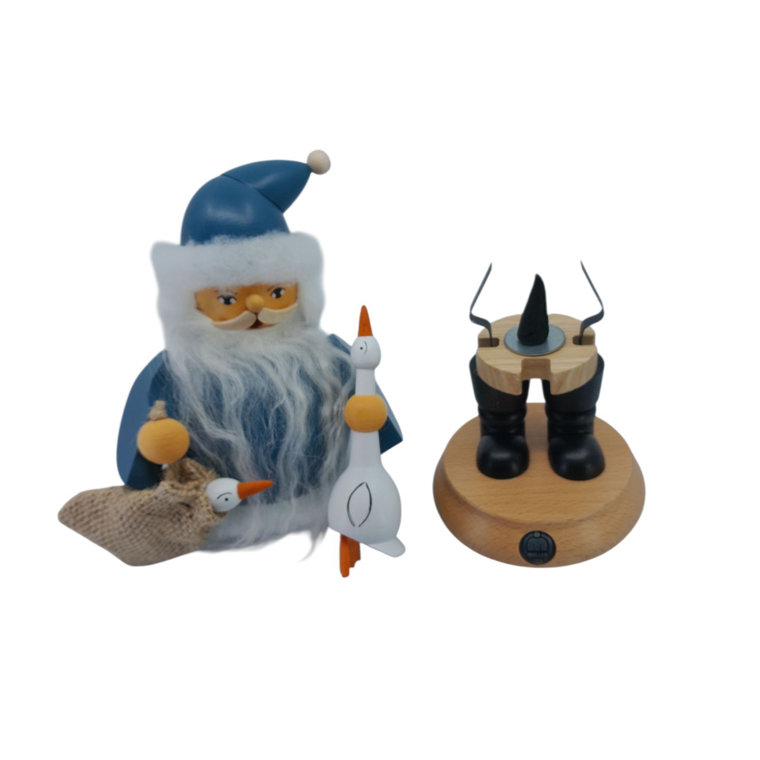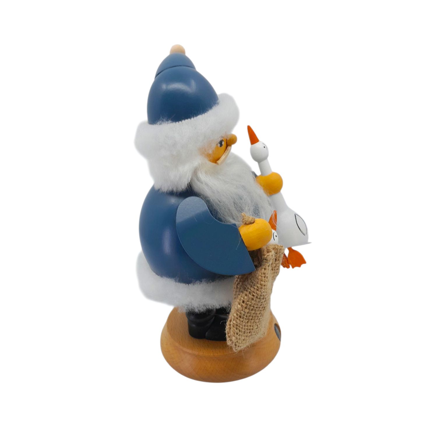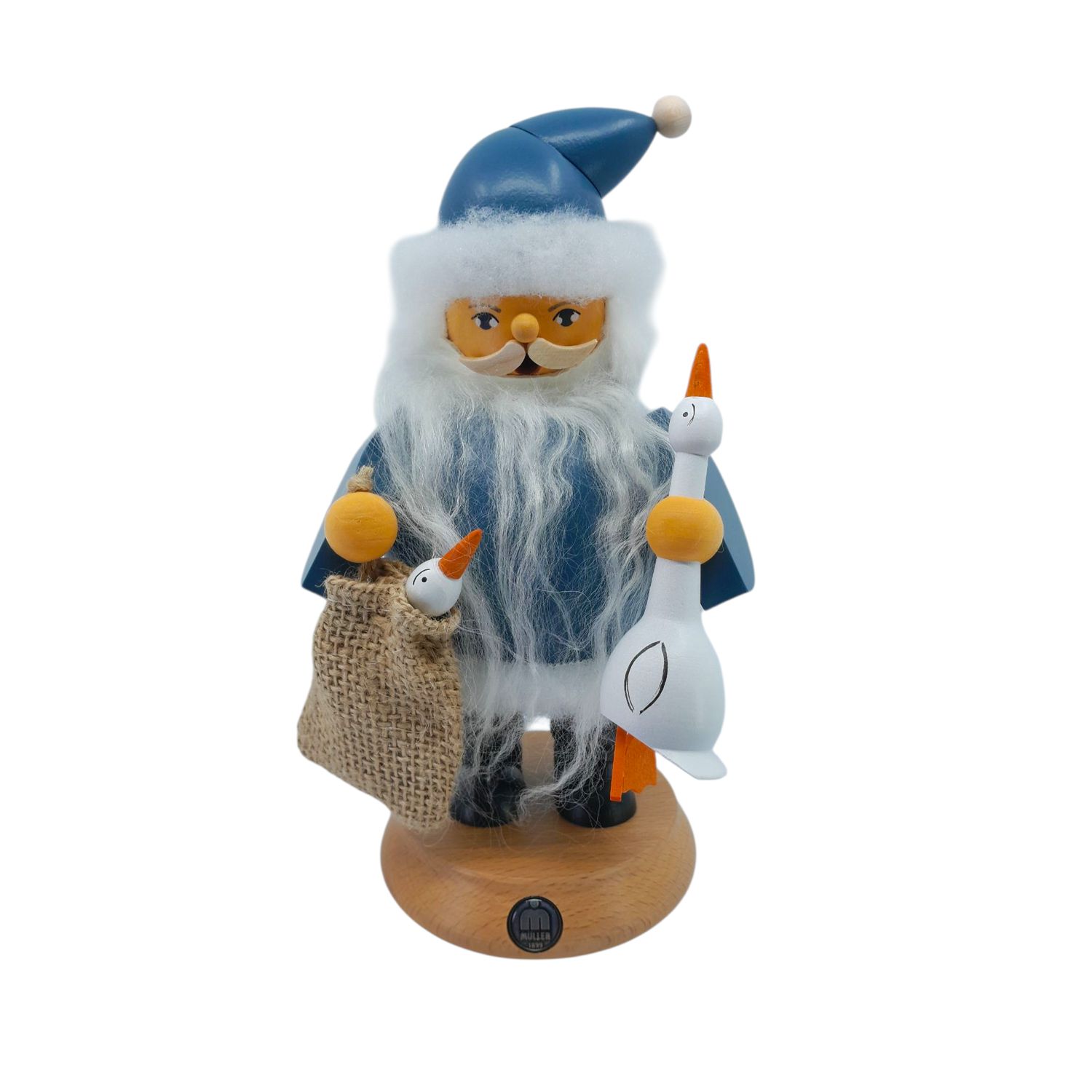 Die Räucherfigur „Nordic Santa mit Gans Auguste“ der Firma Müller ist ein liebevoll gestaltetes Kunstwerk. Sie verbindet traditionelle Handwerkskunst mit einem nordischen Charme. Die Figur zeigt einen Weihnachtsmann in blauer Kleidung, wodurch sie sich von den klassischen roten Varianten abhebt und besonders frisch wirkt.