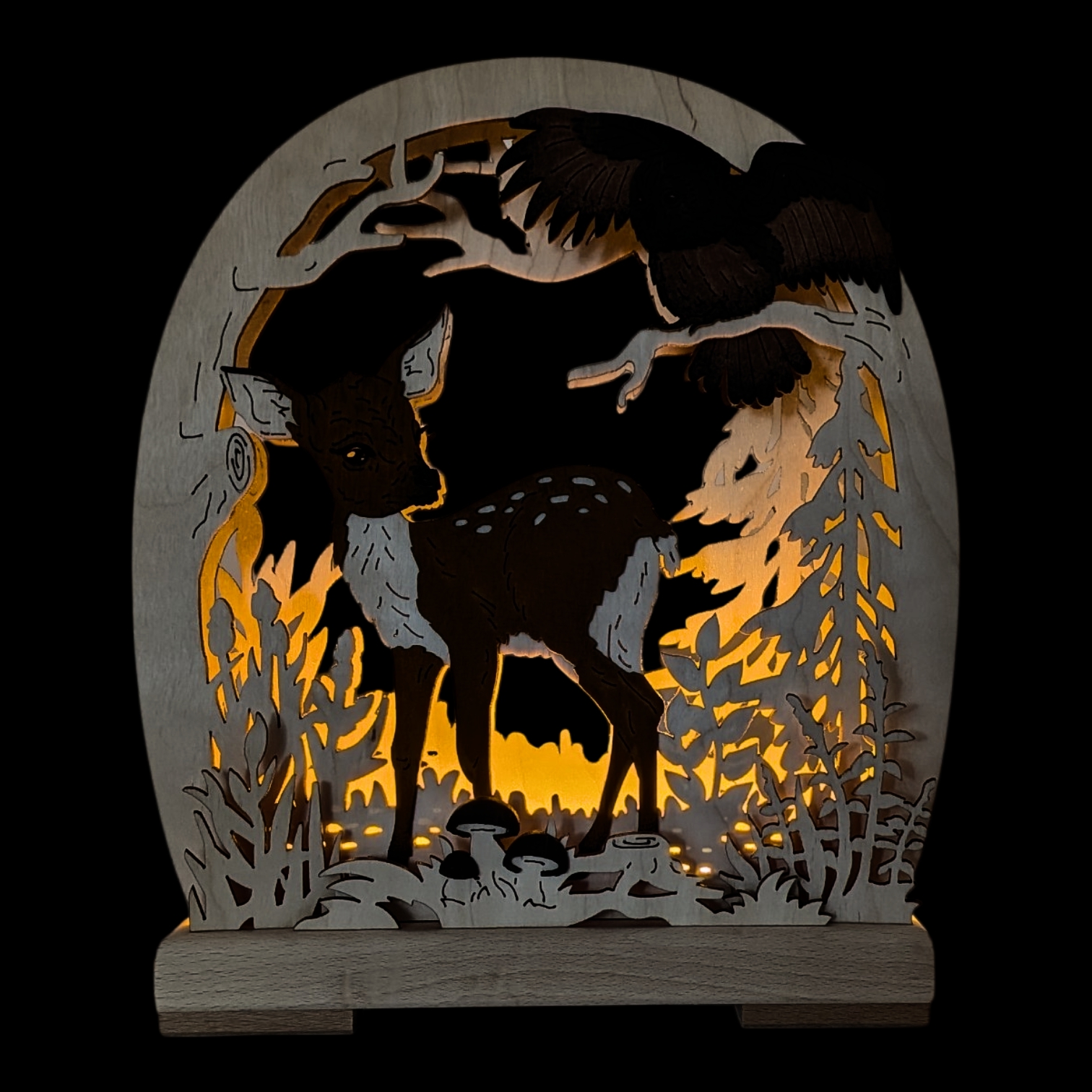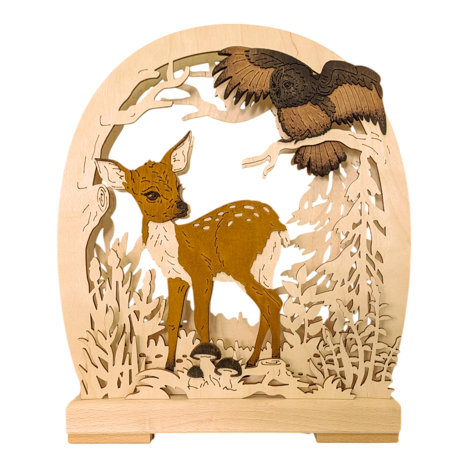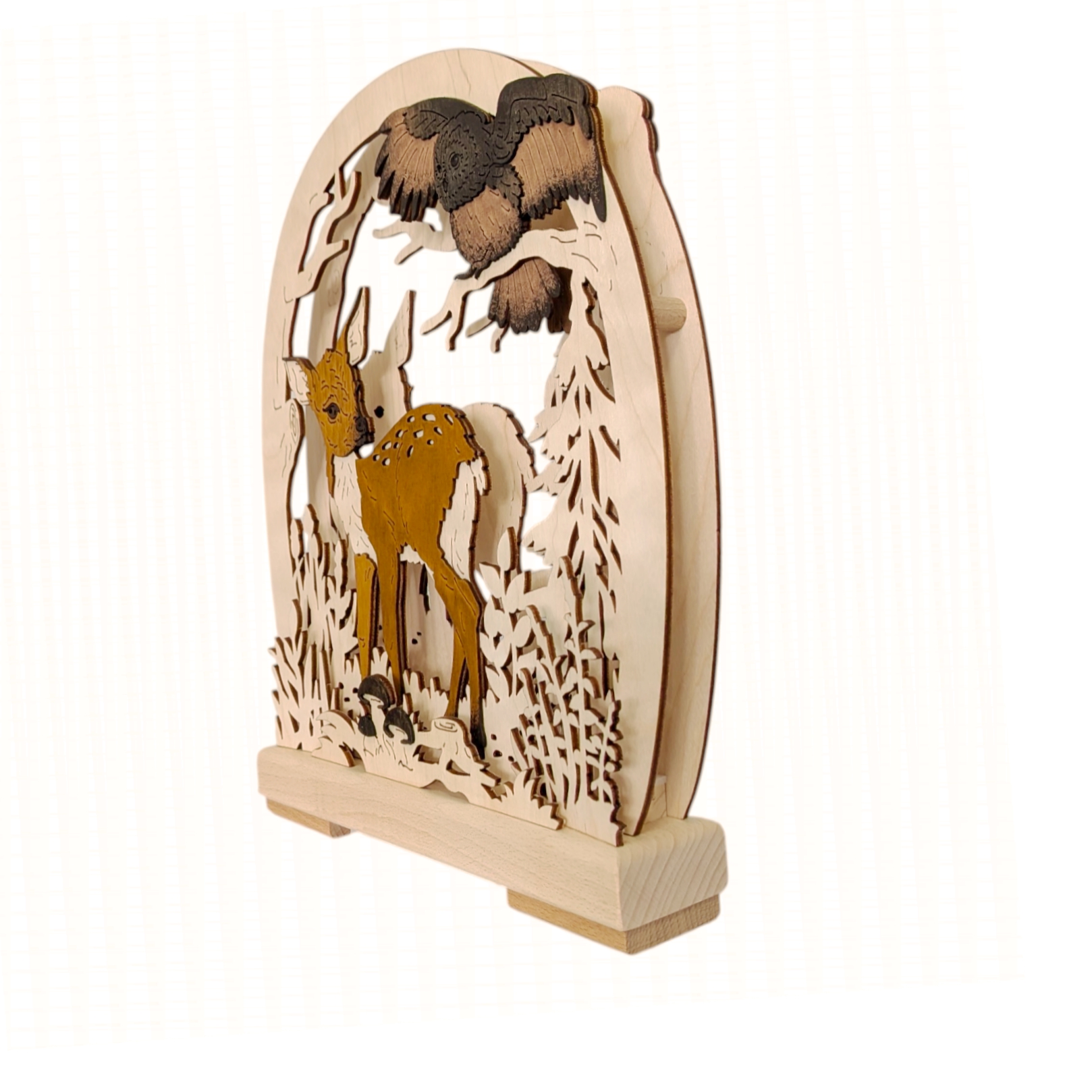 Das zentrale Motiv bildet ein wunderschönes Rehkitz, das neugierig in der Waldlichtung steht. Seine zarten weißen Tupfen auf dem warmen Braun des Fells stechen wunderbar hervor und ziehen alle Blicke auf sich. Über dem Rehkitz thront eine imposante Eule, die majestätisch auf einem Ast sitzt. Ihre detailreich gearbeiteten Federn in tiefen Braun- und Grautönen verleihen ihr eine beeindruckende Präsenz und machen sie zum zweiten Blickfang der Leuchte.