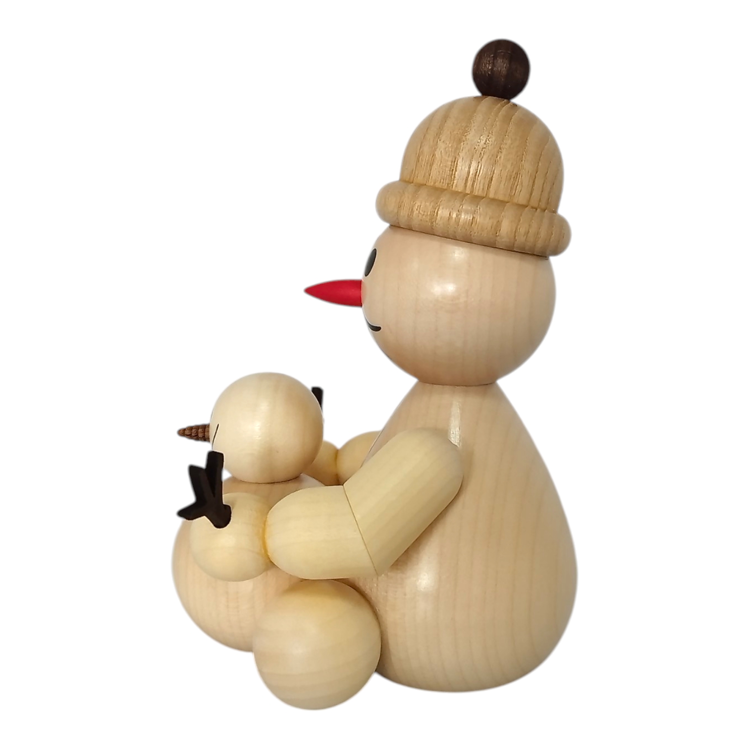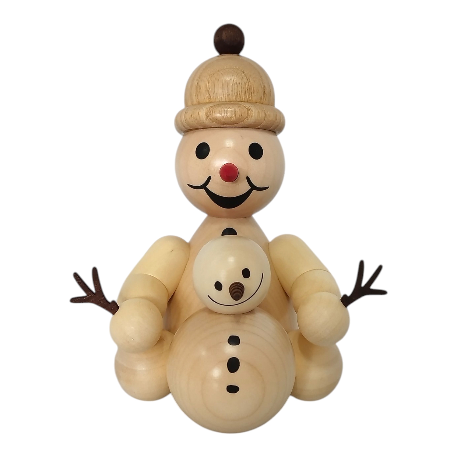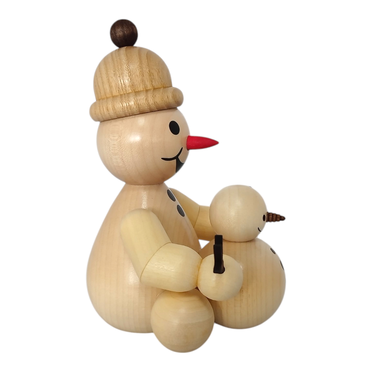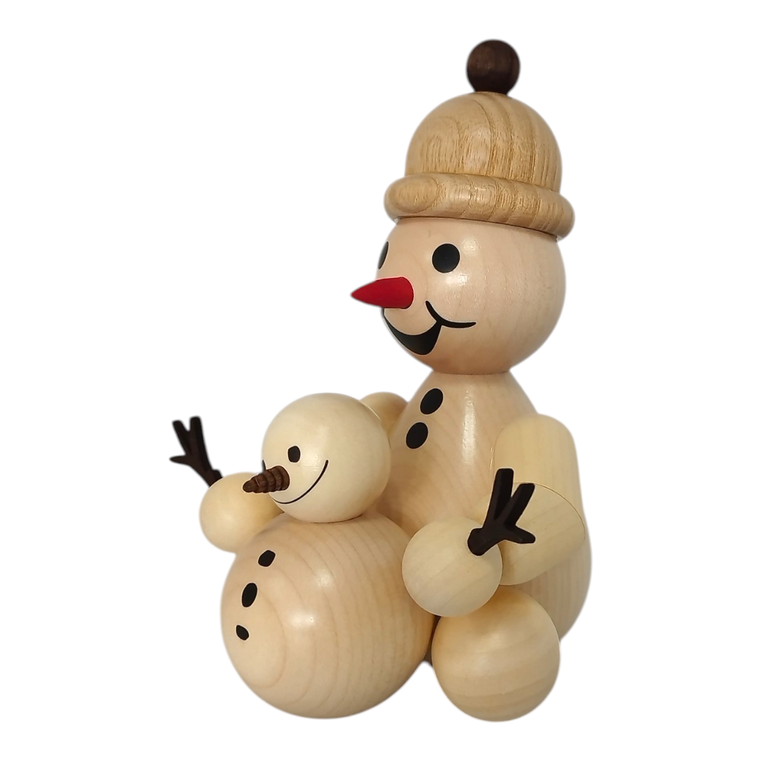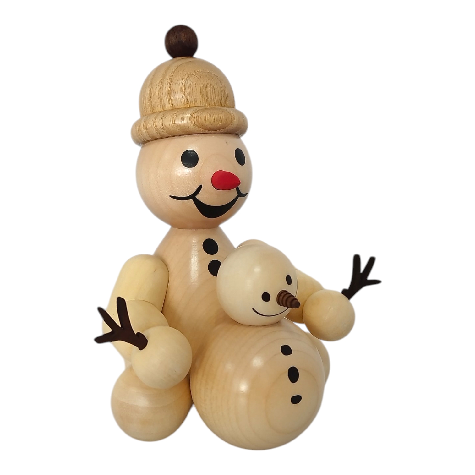 Der Schneemann Junior sitzt entspannt und mit sichtlicher Freude auf dem Boden, während er einen kleinen Schneemann liebevoll in seinen Armen hält. Er trägt eine gemütliche Bommelmütze aus hellem Holz mit einem dunkelbraunen Bommel an der Spitze, die perfekt zu seinem verspielten Erscheinungsbild passt. Sein freundliches Gesicht zeigt ein breites, strahlendes Lächeln, das von einer leuchtend roten Karottennase unterstrichen wird. Schwarze Knopfaugen verleihen ihm einen charmanten und lebendigen Ausdruck, der sowohl Kinder als auch Erwachsene zum Schmunzeln bringt.
