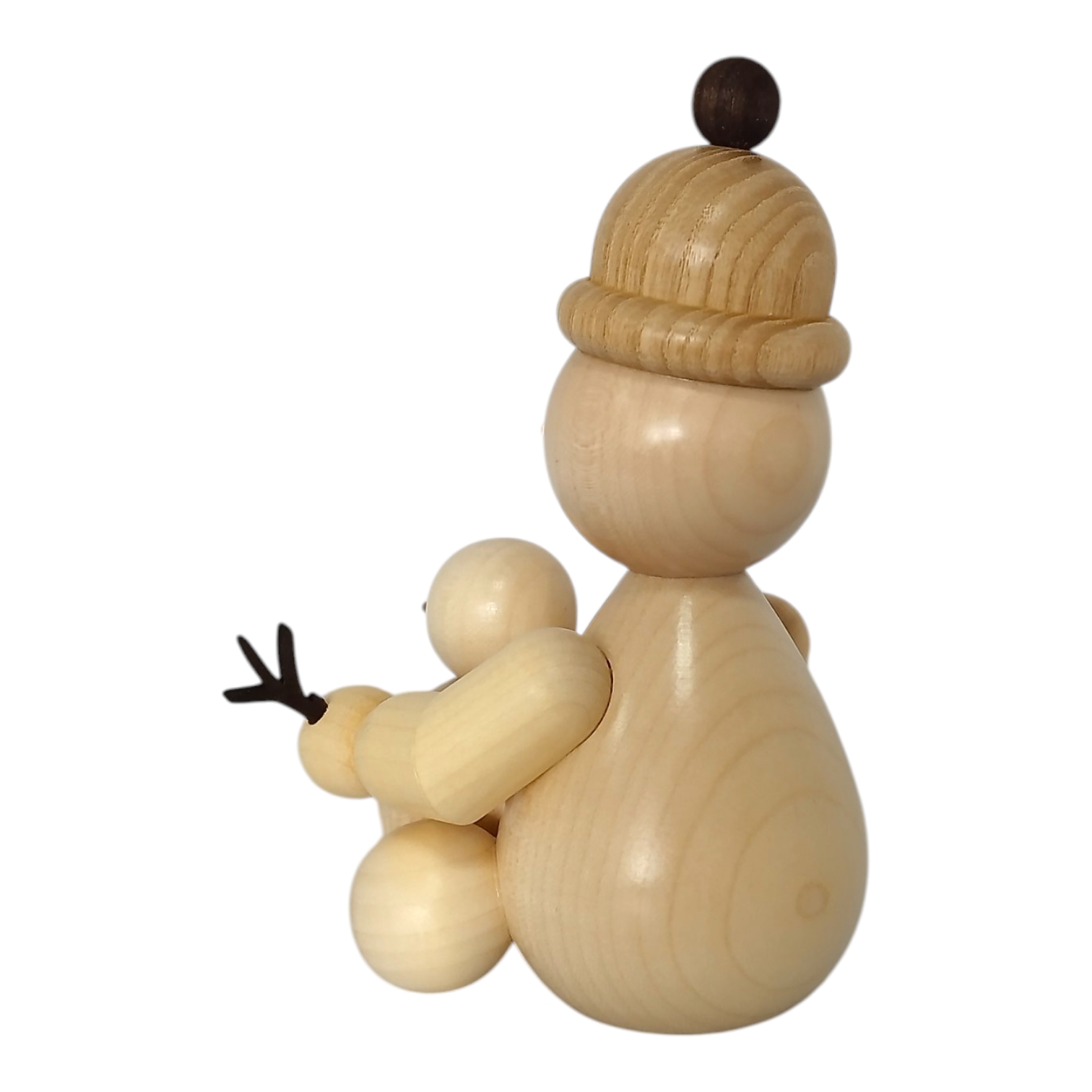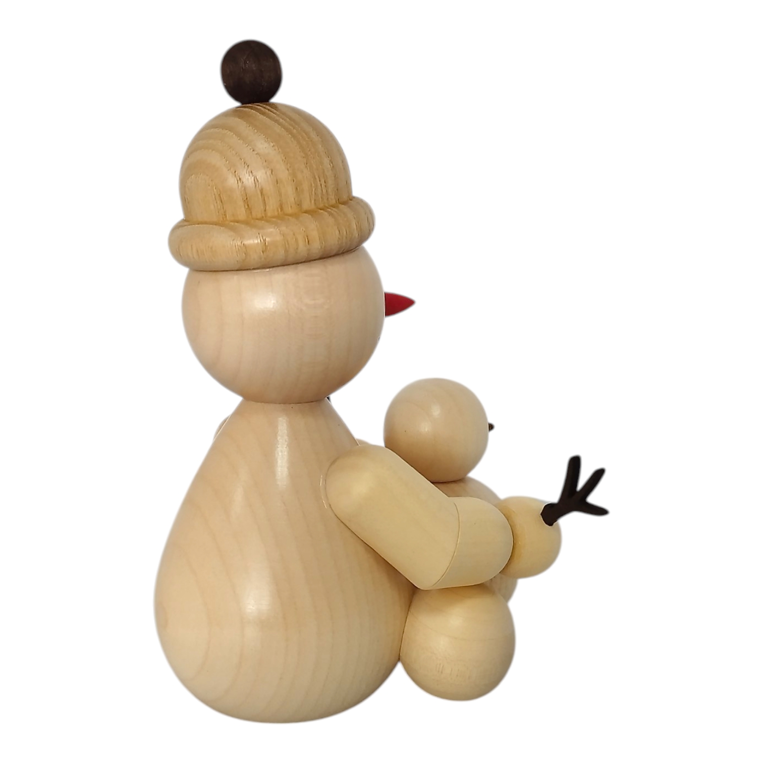 Mit seinen ausgestreckten Armen hält er den kleinen Schneemann behutsam vor sich – ein herzliches Bild von Fürsorge und Zusammengehörigkeit. Der kleine Schneemann in seinen Armen ist ebenfalls liebevoll ausgearbeitet und trägt eine zierliche Möhrennase sowie verspielte Äste als Arme. Die warmen, natürlichen Holztöne und die sorgfältig gearbeiteten Details bringen die Figurengruppe besonders zur Geltung.