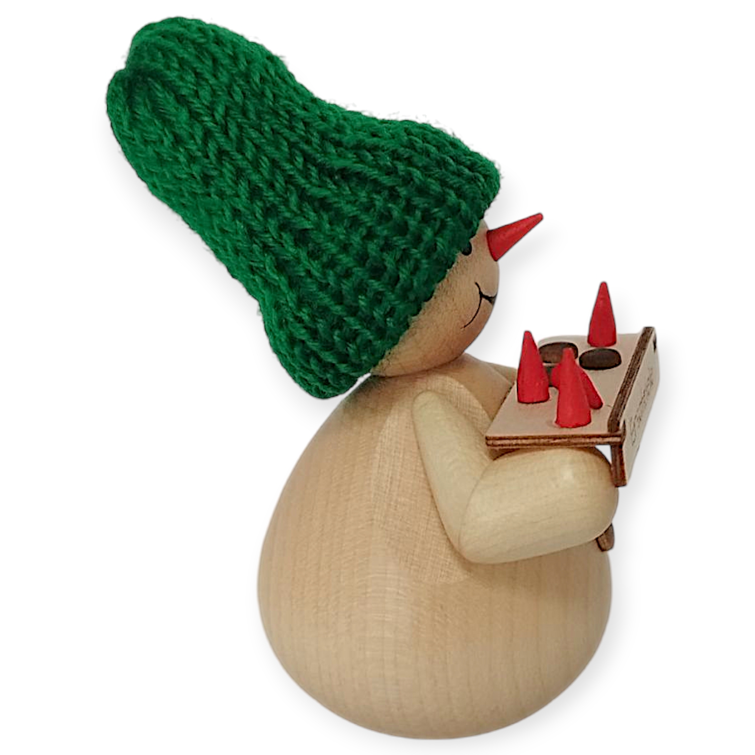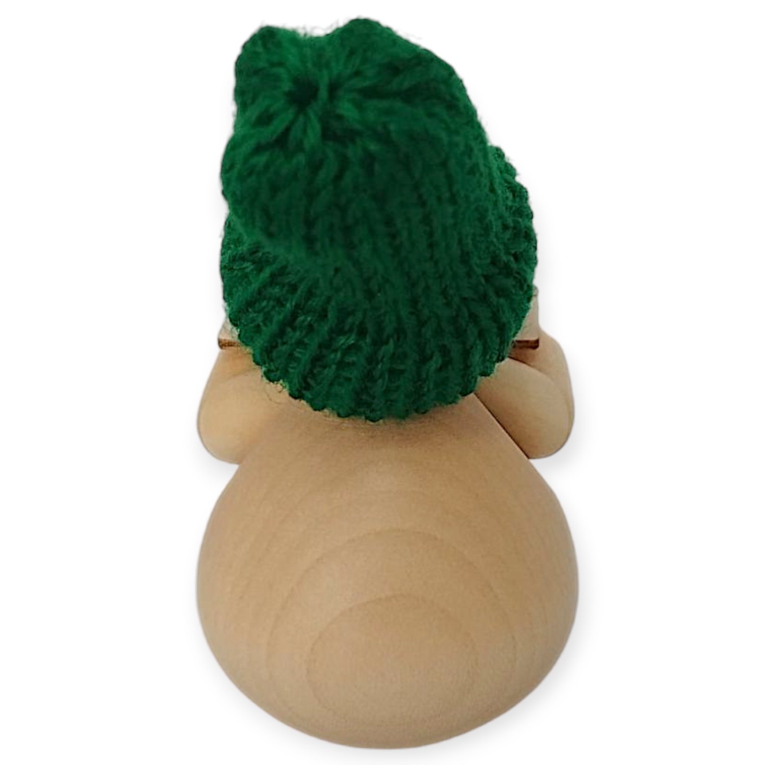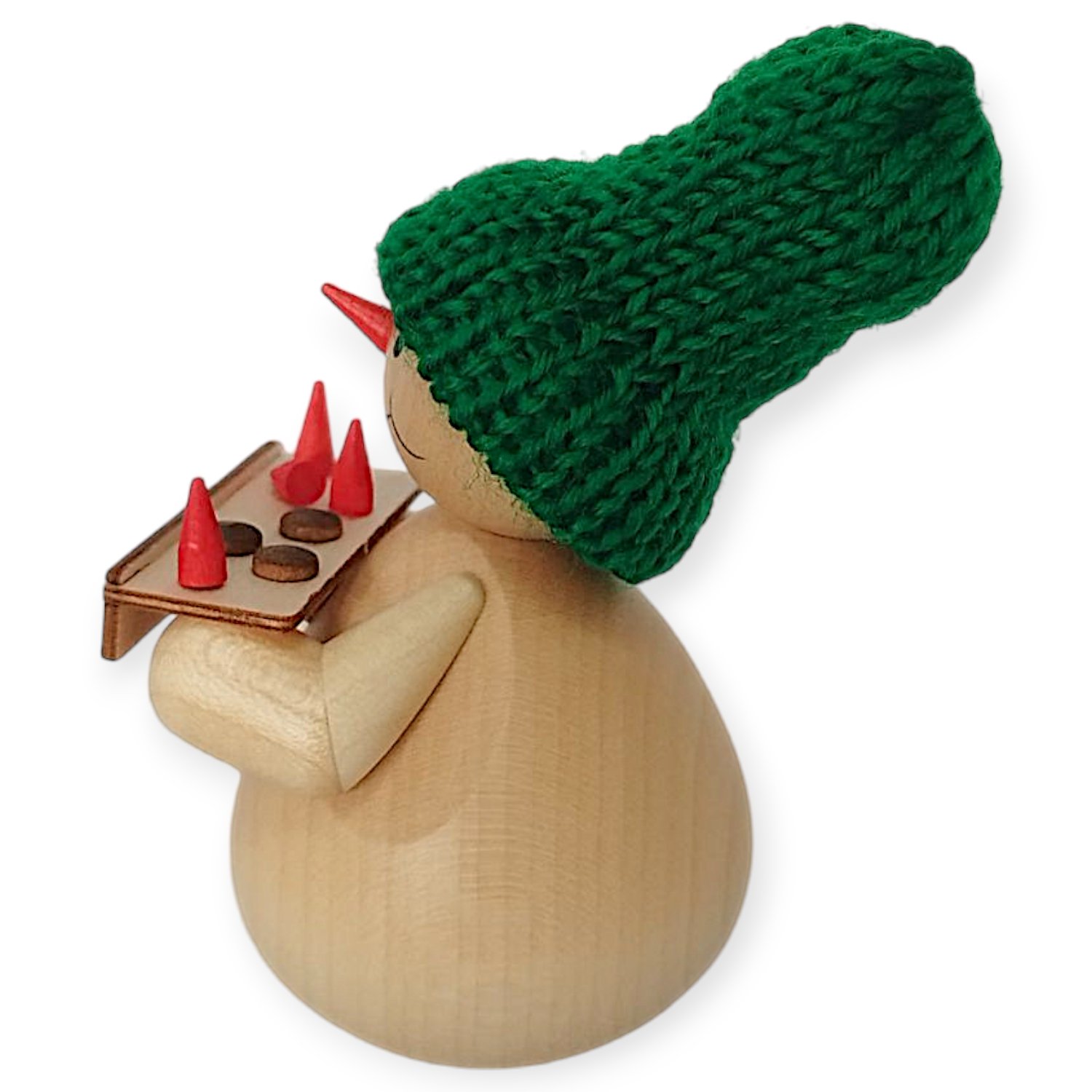 Man fertigte den Schneemann aus hellem, naturbelassenem Holz. Sein Körper hat eine runde, glatte Form, die ihm eine freundliche Statur verleiht. Er trägt eine leuchtend grüne, gestrickte Mütze, die in schönem Kontrast zum hellen Holz steht. Sein Gesicht besticht durch seine Einfachheit: Ein kleines rotes Hütchen dient als seine Nase, während man die Augen und das verschmitzte Lächeln aufgemalt hat. Ein kleiner Holzknopf auf seinem Bauch rundet sein Erscheinungsbild ab.