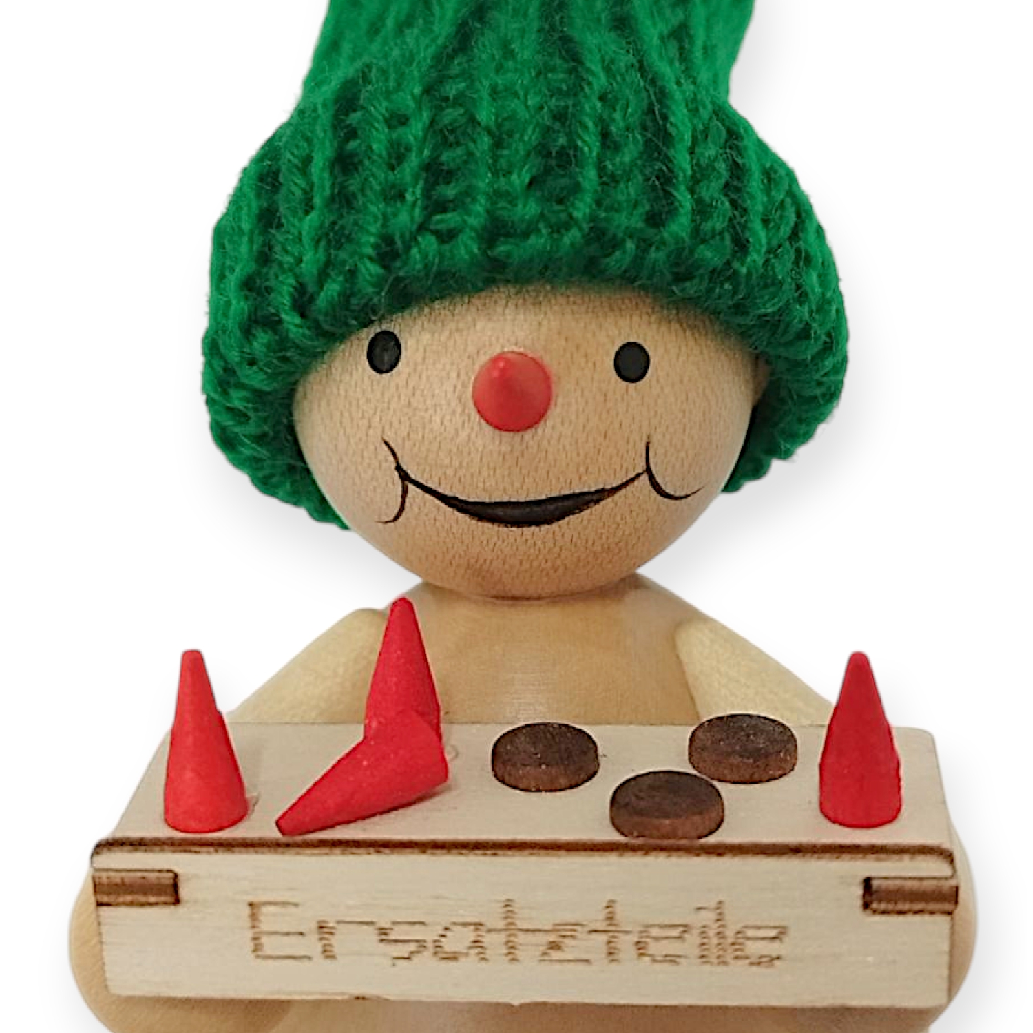 Das Besondere an dieser Figur ist der Bauchladen, den er vor sich hält. Der kleine Holzkasten hat die Aufschrift Ersatzteile. Darauf liegen verschiedene Einzelteile, darunter kleine rote Karotten sowie flache, braune Knöpfe. Dieses detailreiche und humorvolle Element verleiht dem Schneemann einen einzigartigen Charakter und spielt auf die handwerkliche Herstellung anderer Rauta Figuren an. Der Schneemann bietet Ersatzteile für seine Artgenossen an.