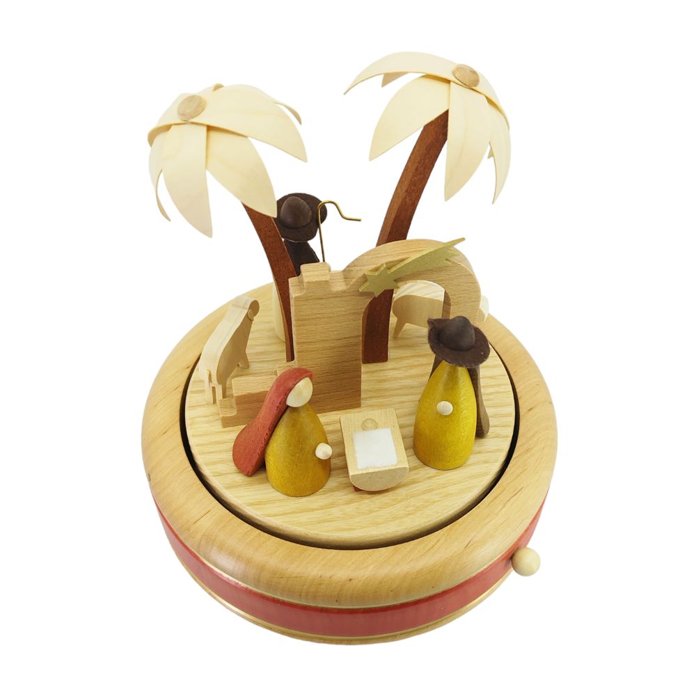 Die Spieldose präsentiert sich auf einem naturbelassenen Sockel, der seitlich von goldenen Akzenten mit einem roten Streifen verziert ist. Auf diesem Sockel ist die Szene der Geburt Christi in klaren Formen dargestellt.